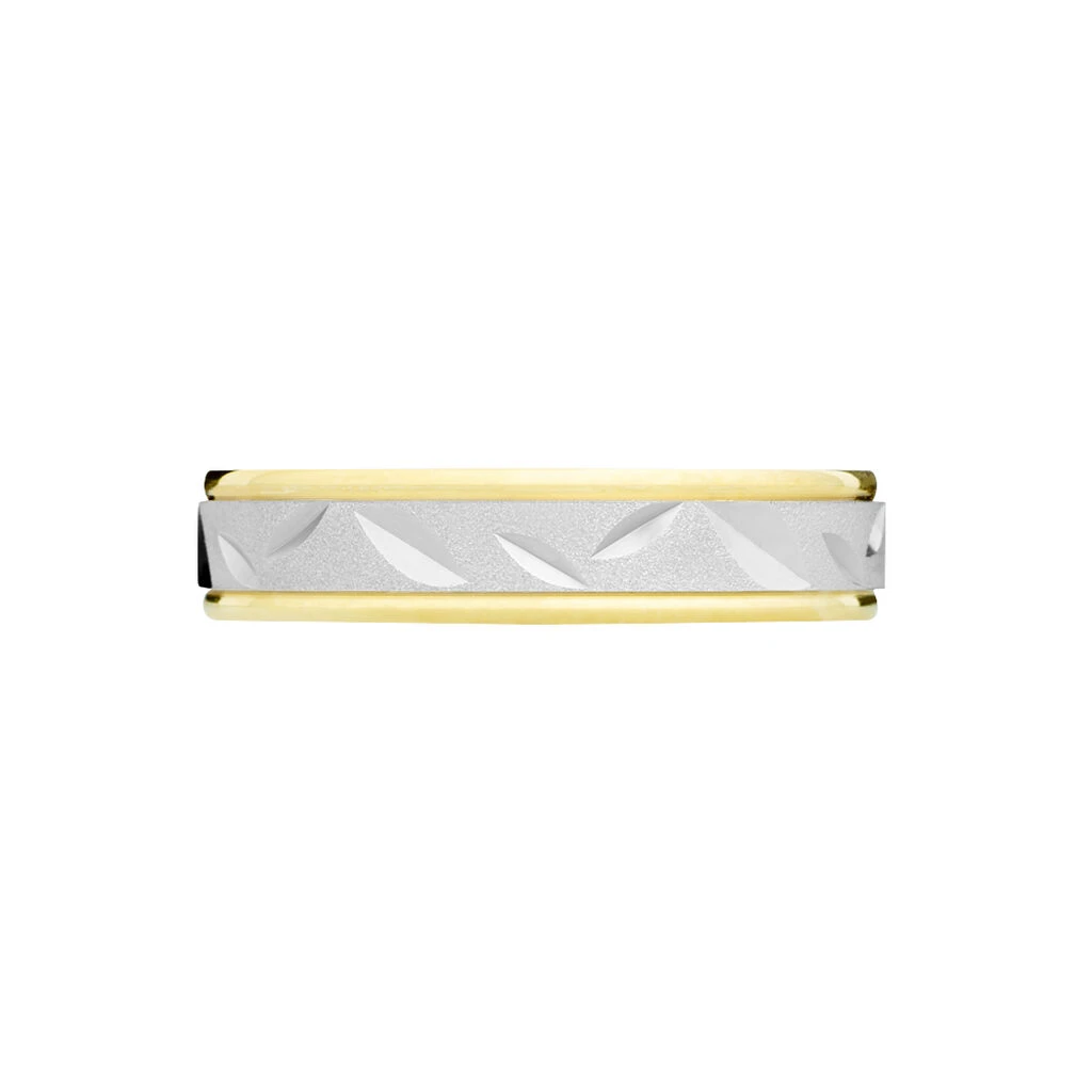 Alliance Or Bicolore Blanc Et Jaune 375/1000 Fantaisie Ruban Satine Motif Feuilles Ciselées 5mm