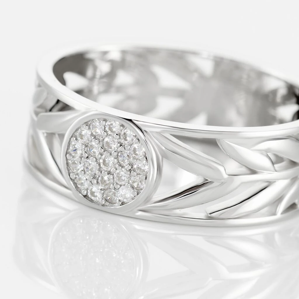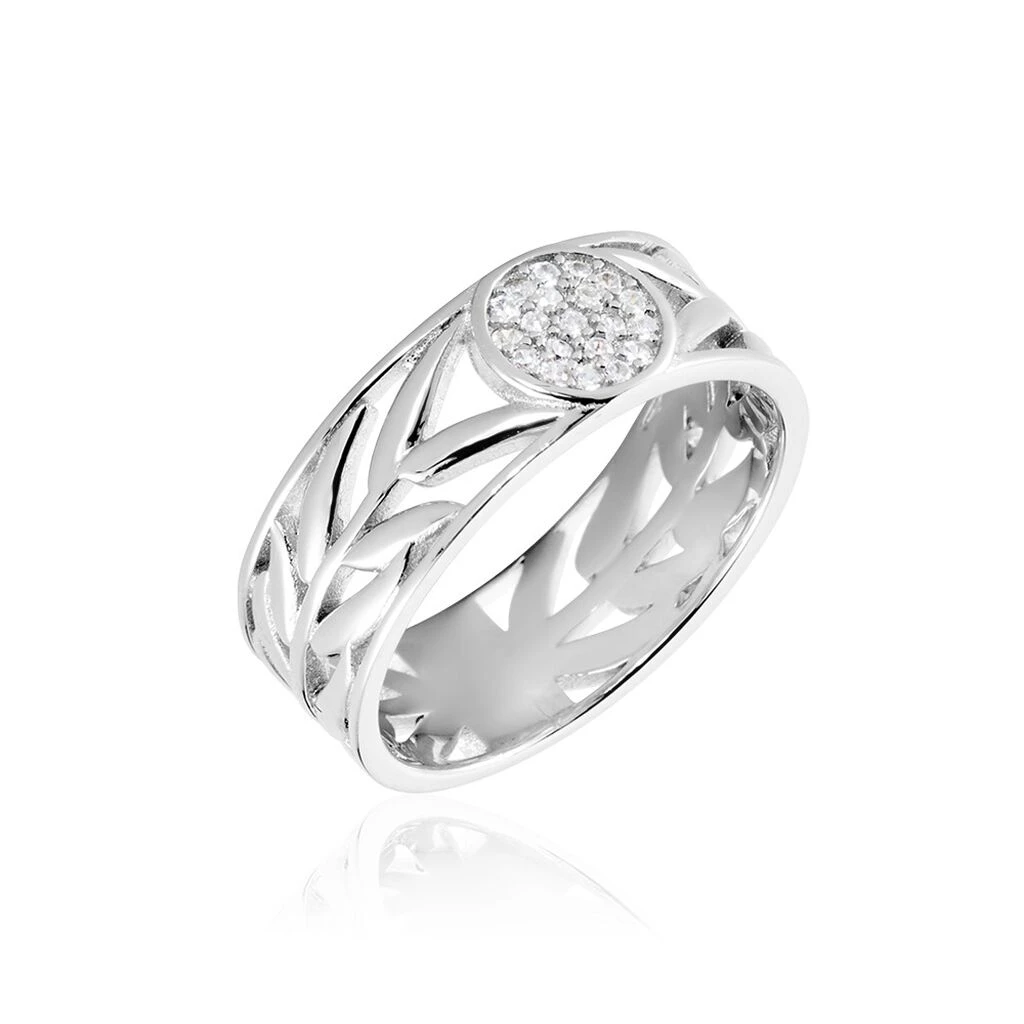 Bague Argent Blanc 925/1000 Pastille Pavage Oxydes De Zirconium Motif Feuillage