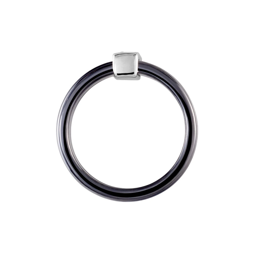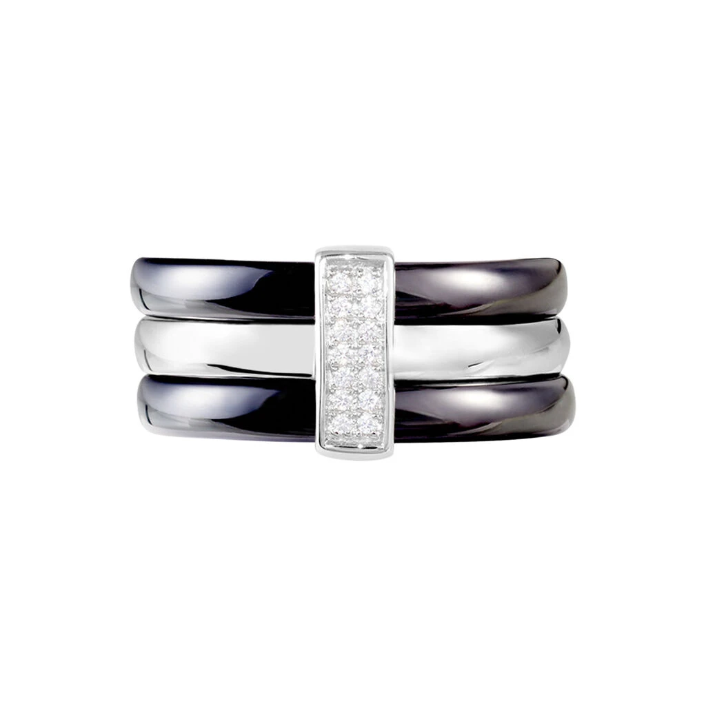 Bague Argent Blanc 925/1000 Ceramique Noire 2 Anneaux Ceramique 1 Anneau Argent Oxydes De Zirconium Blancs