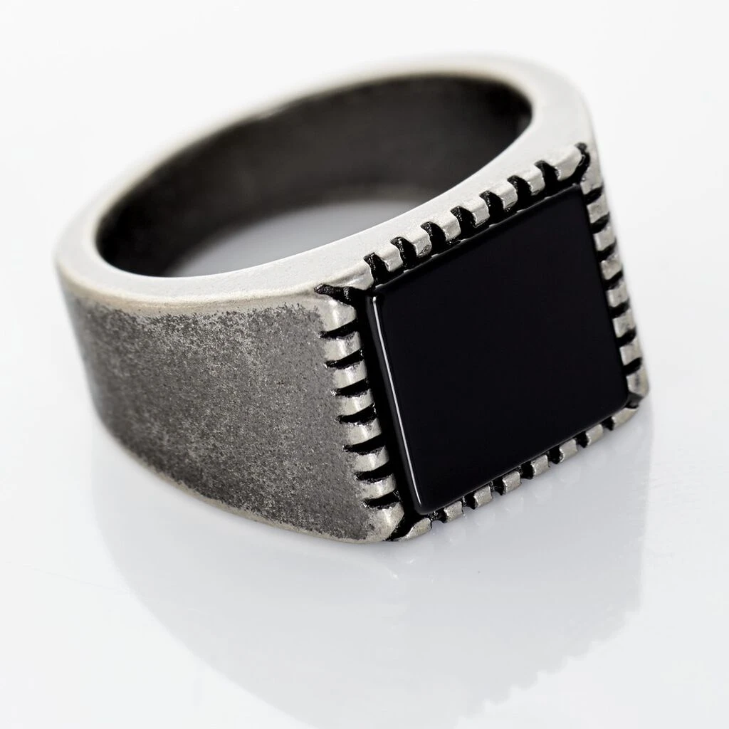 Bague Chevaliere Acier Vieillit Carre Agate Noire