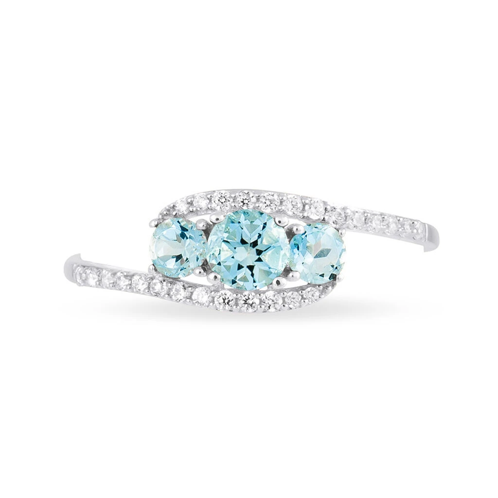 Bague Or Blanc 375/1000 Trilogie Topazes Bleus 0.57ct Sertis 4 Griffes Et Oxydes De Zirconium