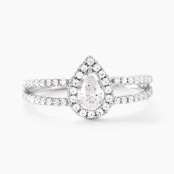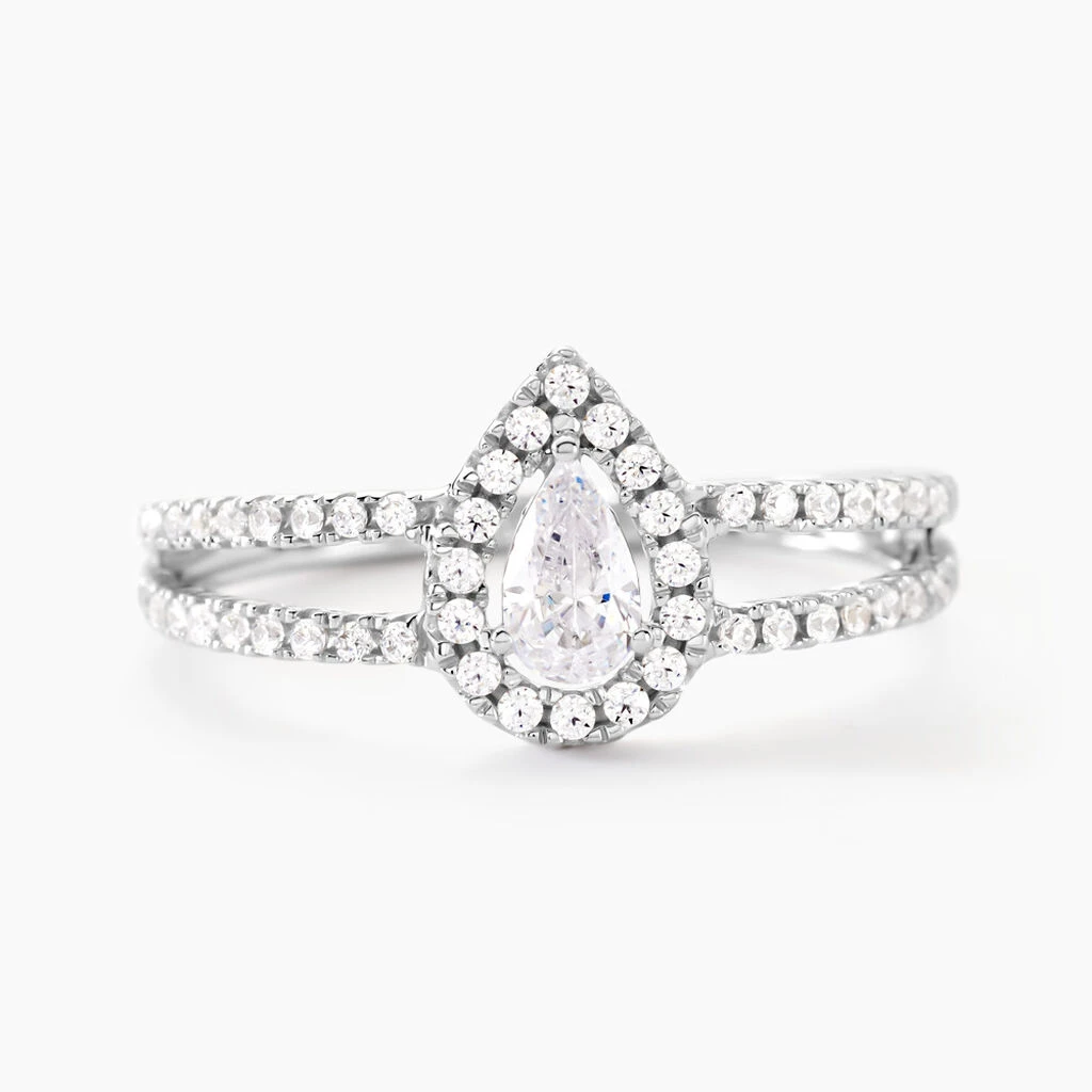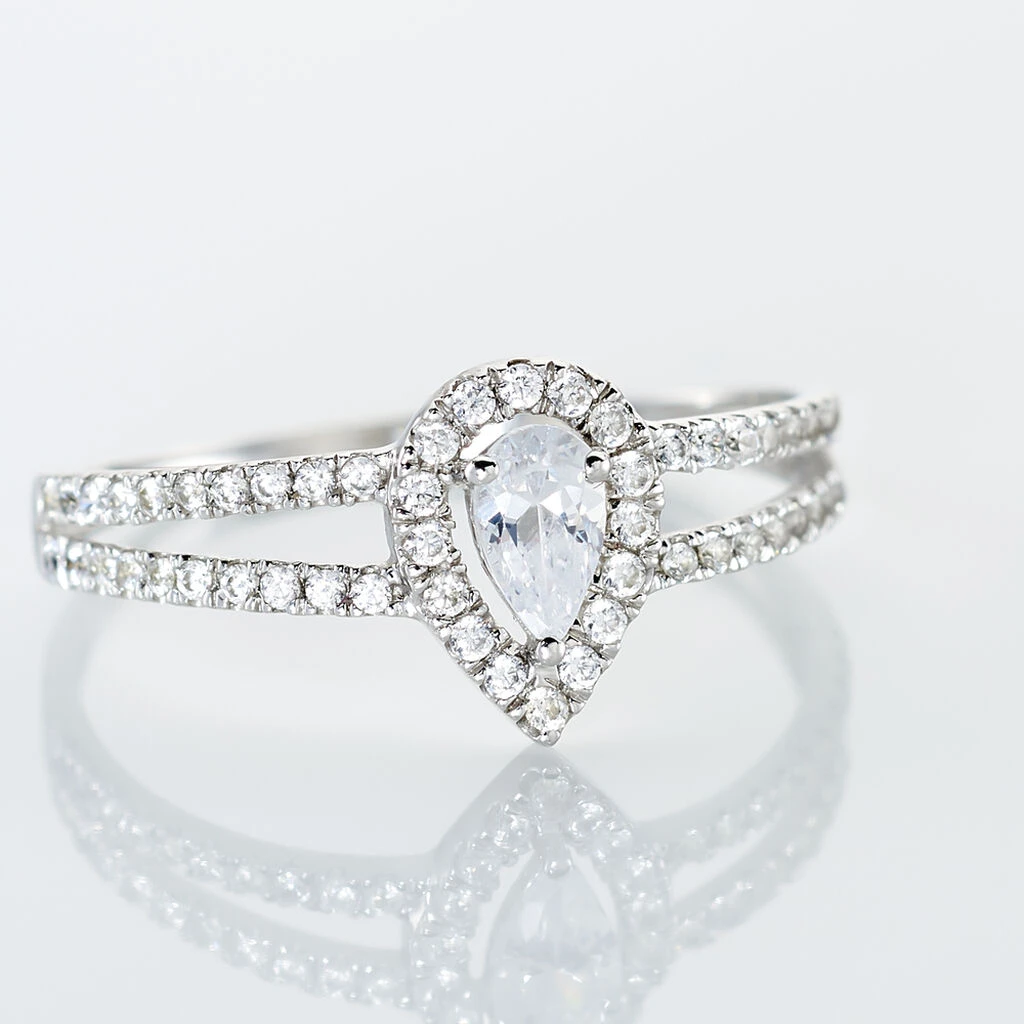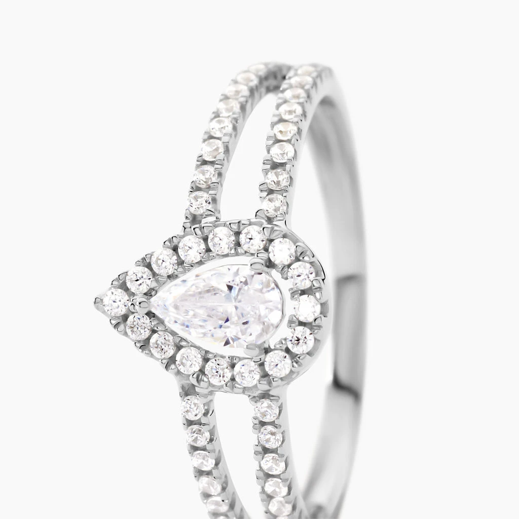 Bague Or Blanc 375/1000 Oxyde De Zirconium Central Forme Poire Accompagne Oxydes De Zirconium
