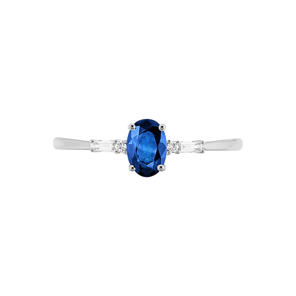 Bague Or Blanc 375/1000 Saphir Central Forme Ovale Accompagne Diamants Taille Baguette
