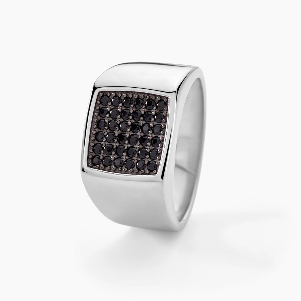 Chevaliere Argent Blanc 925/1000 Plateau Carre Oxydes De Zirconium Noirs