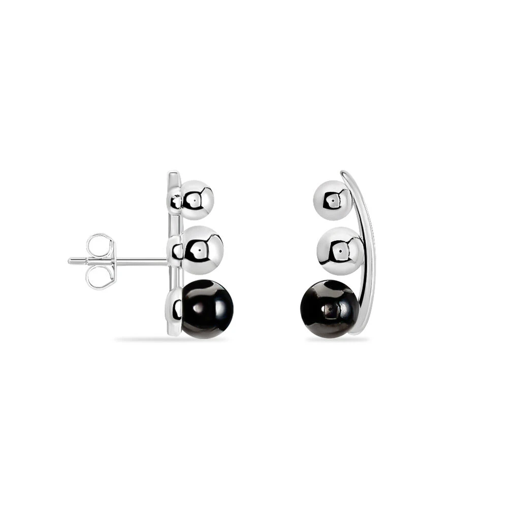 Bijoux D’oreilles Argent Blanc 925/1000 Ear Cuff Boules Ceramique Noire Et Boules Argent