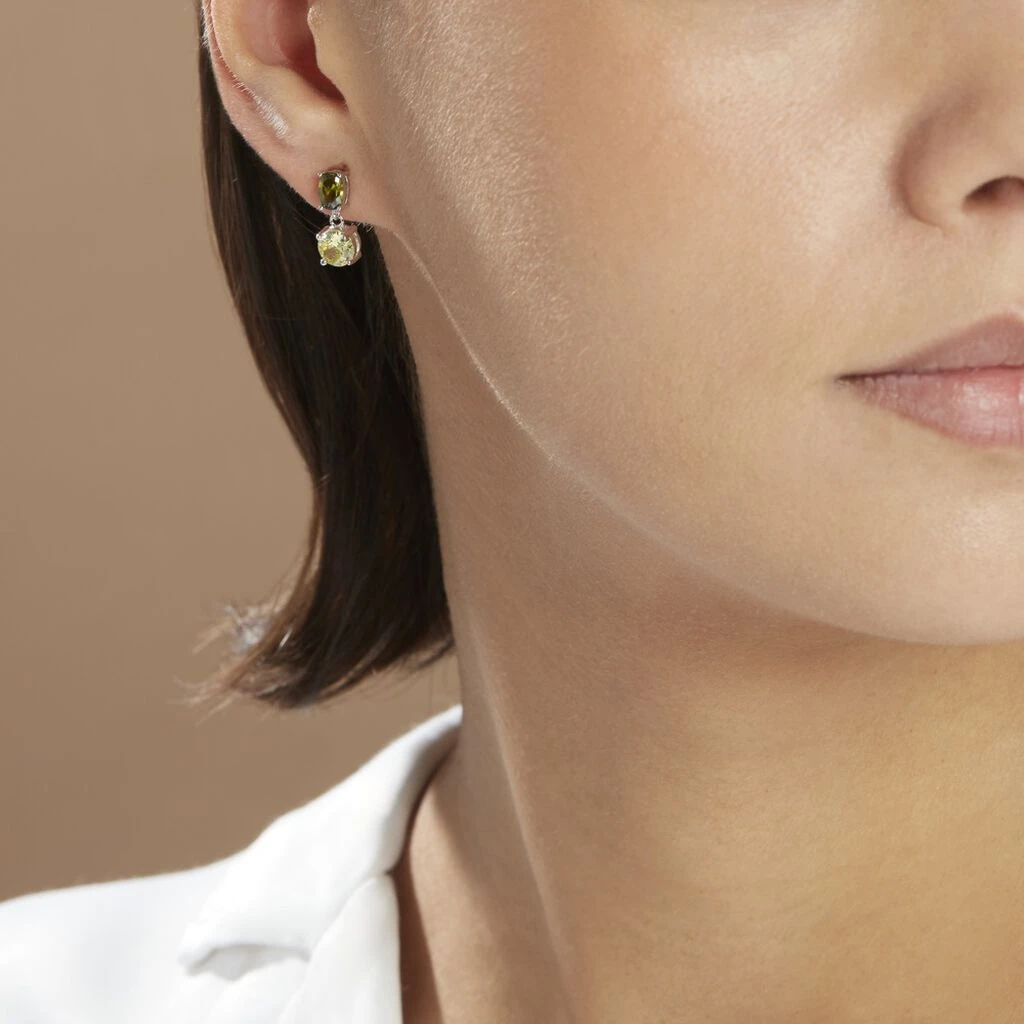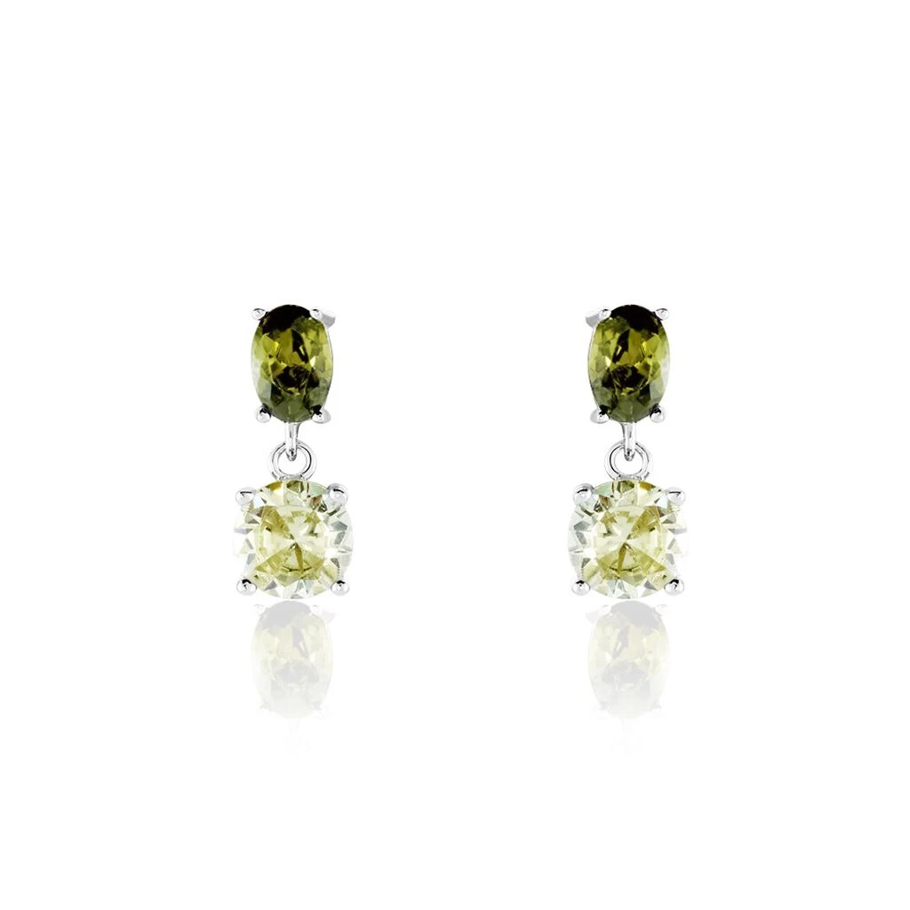 Boucles D’oreilles Pendantes Argent Blanc 925/1000 Serti Griffes Oxydes De Zirconium Vert Clair Et Olive