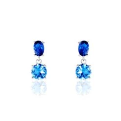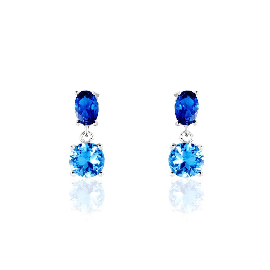 Boucles D’oreilles Pendantes Argent Blanc 925/1000 Serti Griffes Oxydes De Zirconium Bleu Clair Et Bleu