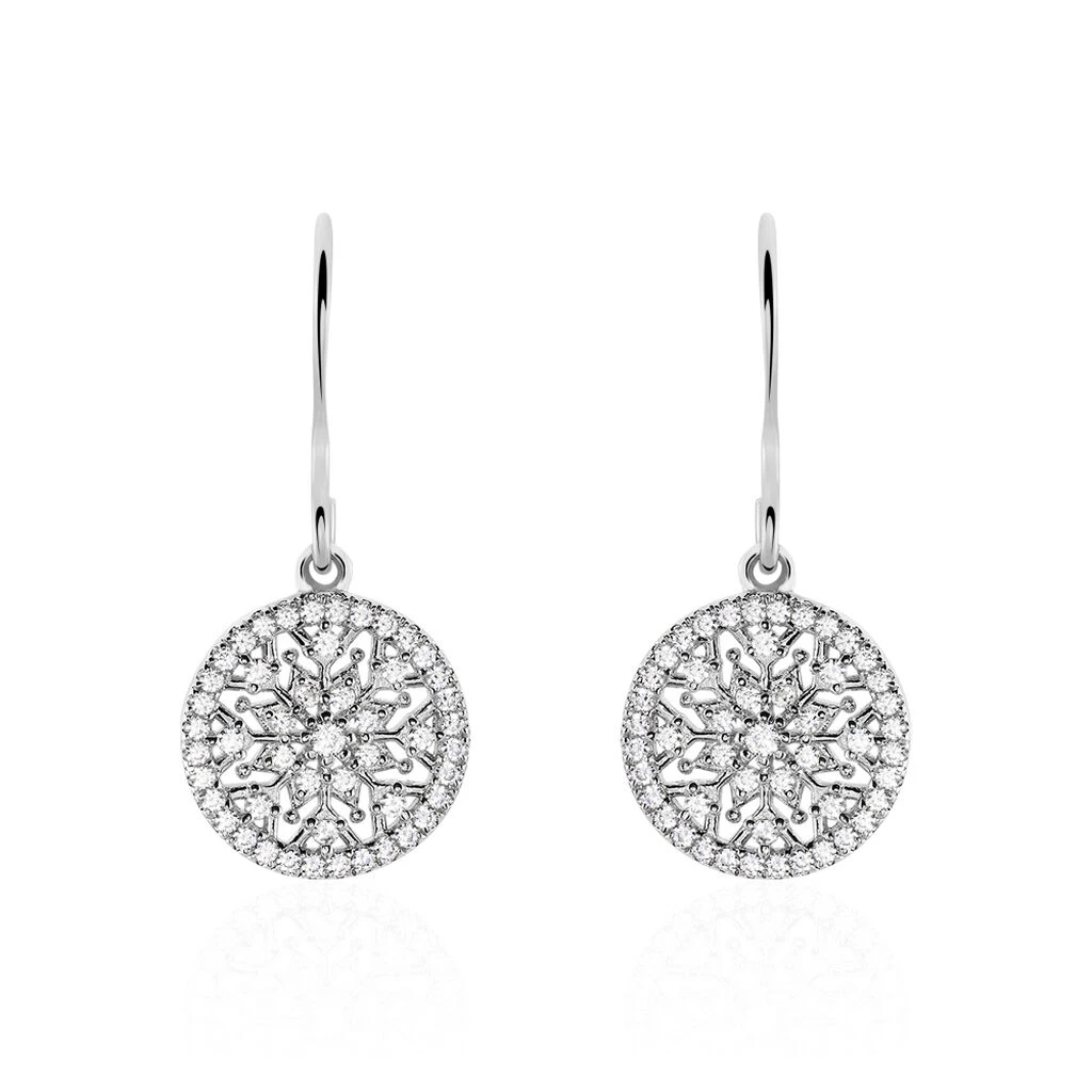 Boucles D’oreilles Argent Blanc 925/1000 Forme Flocons De Neige Pastille Pavage Oxydes De Zirconium
