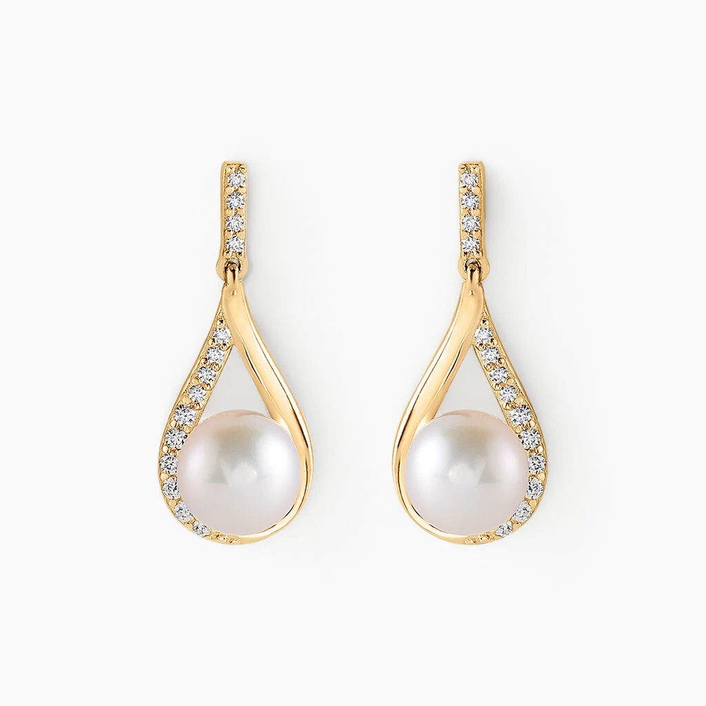 Boucles D’oreilles Or Jaune 375/1000 Gouttes Semi Pavage Oxydes De Zirconium Perles De Culture 5mm