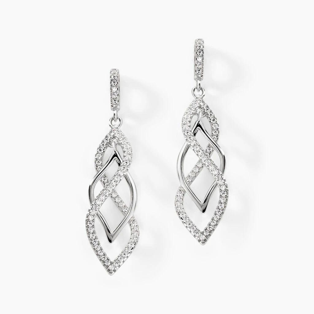 Boucles D’oreilles Argent Blanc 925/1000 Formes Gouttes Torsadees Entrelacees Pavage Oxydes De Zirconium