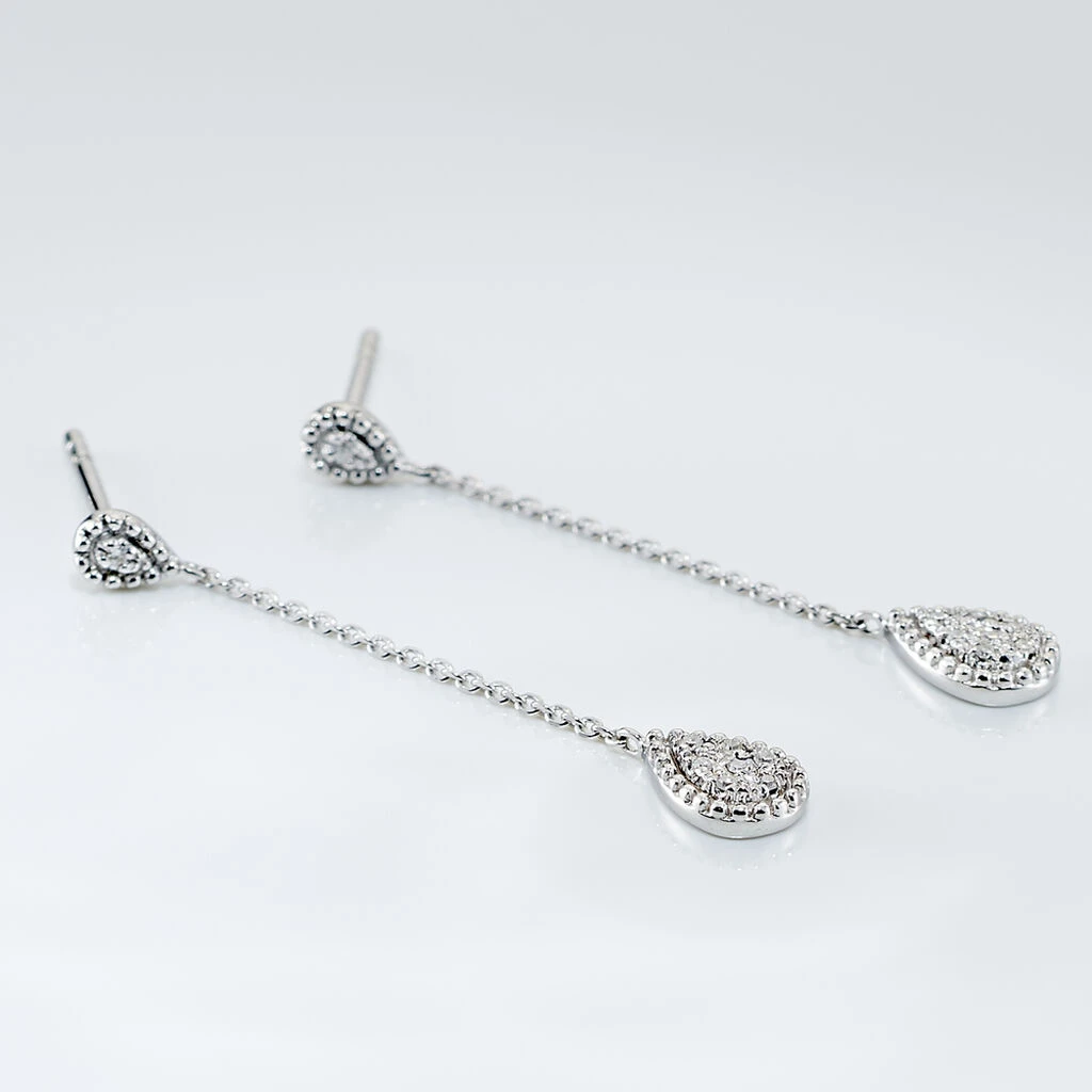 Boucles D’oreilles Or Blanc 375/1000 Pendantes Forme Goutte Pavage Diamants