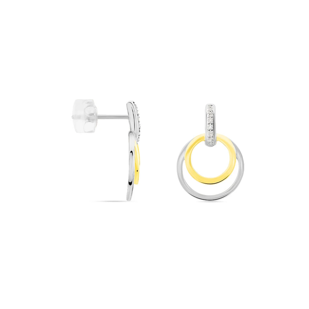 Boucles D’oreilles Pendantes Or 375/1000 Bicolore Blanc Et Jaune Doubles Cercles Ajoures Et Barrettes Pavage Diamants