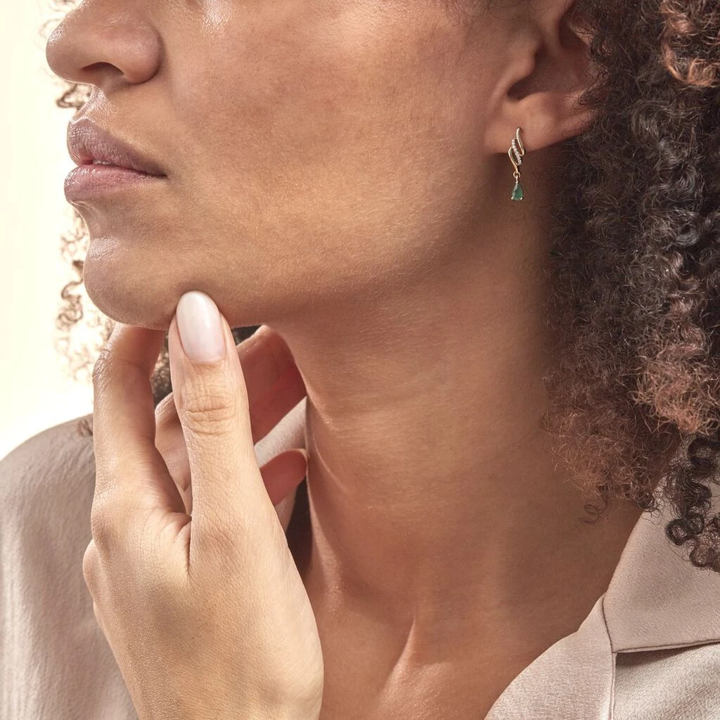Boucles D’oreilles Pendantes Or Jaune 375/1000 Emeraude Forme Poire Sertie Griffes Motif Vagues Pavage Diamants