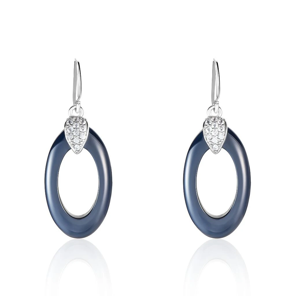Boucles D’oreilles Pendantes Argent Blanc 925/1000 Ceramiques Bleues Ovales Pavages Oxydes De Zirconium
