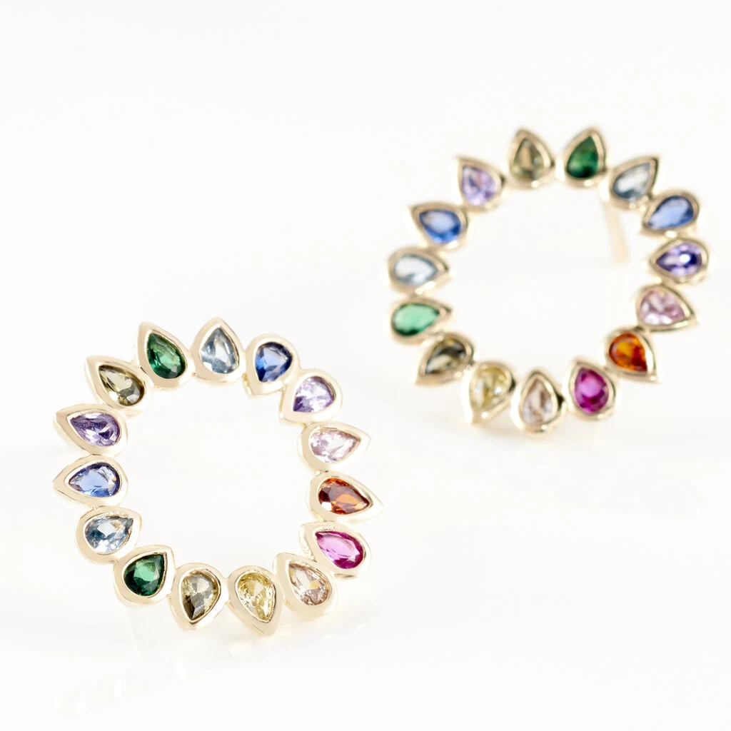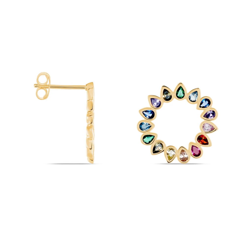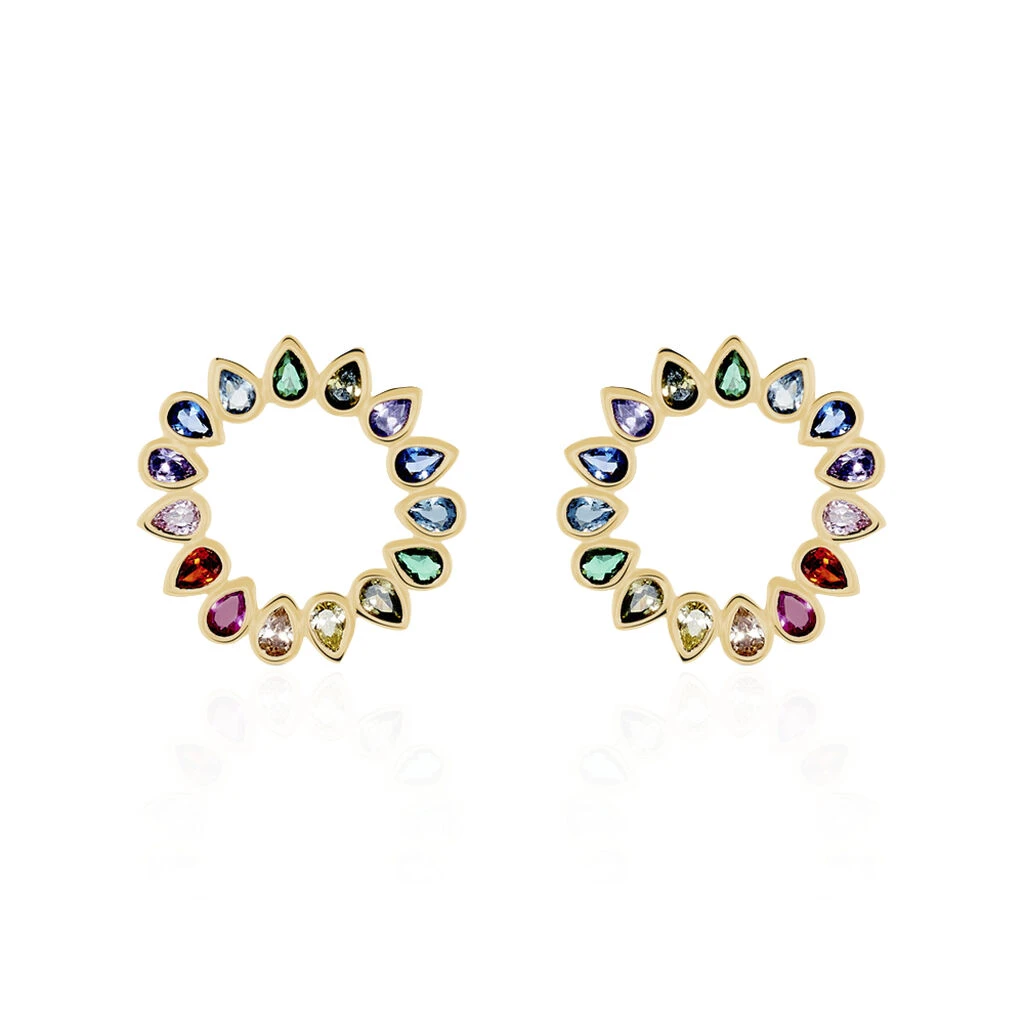 Boucles D’oreilles Pendantes Plaque Or Jaune Formes Cercles Ajoures Pierres Multicilores