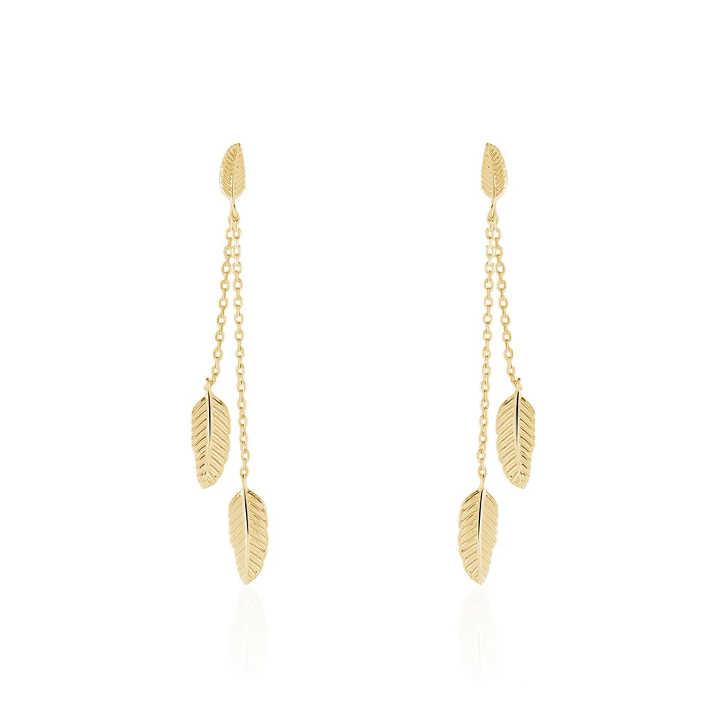 Boucles D’oreilles Plaque Or Jaune Double Chaines Pampilles Plumes