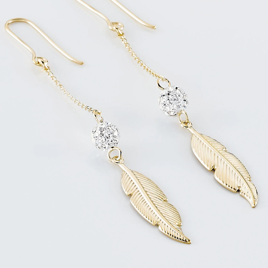Boucles D’oreilles Or Jaune 375/1000 »powoo » Pendantes Plume Strass Blanc