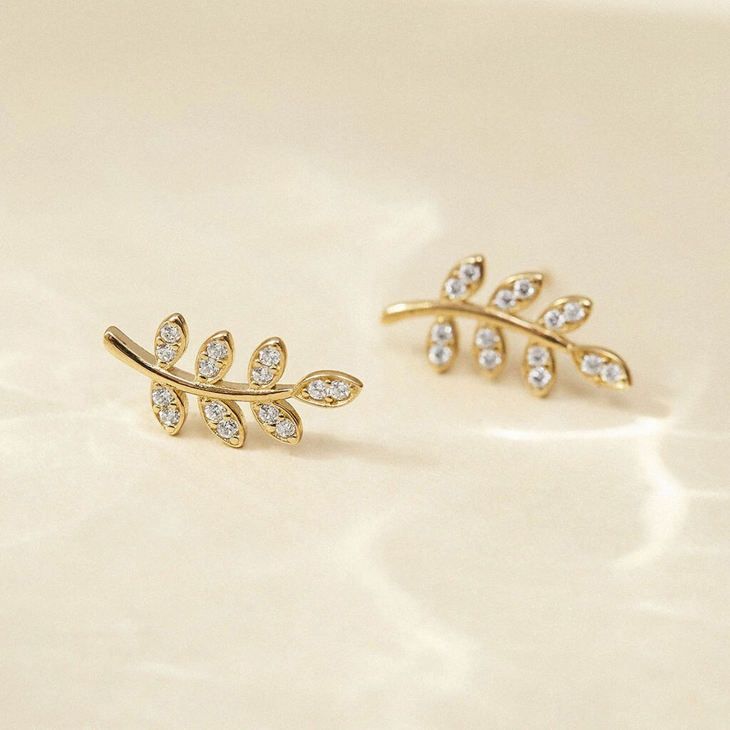Boucles D’oreilles Or Jaune 375/1000 Puces Formes Feuilles Pavage Oxydes De Zirconium