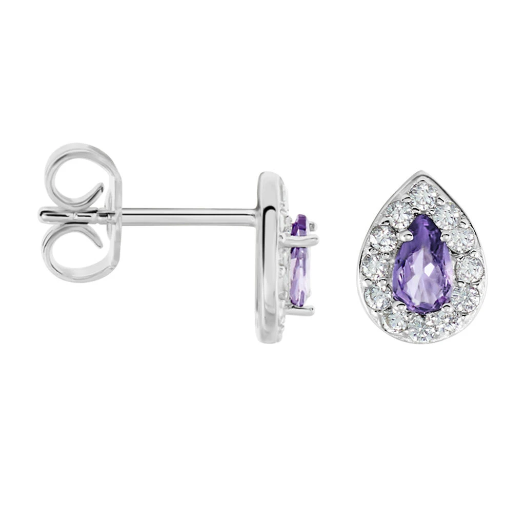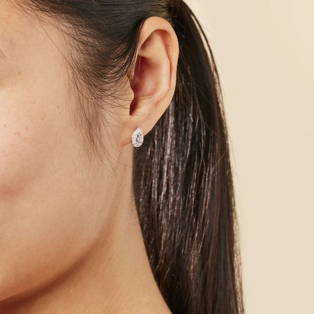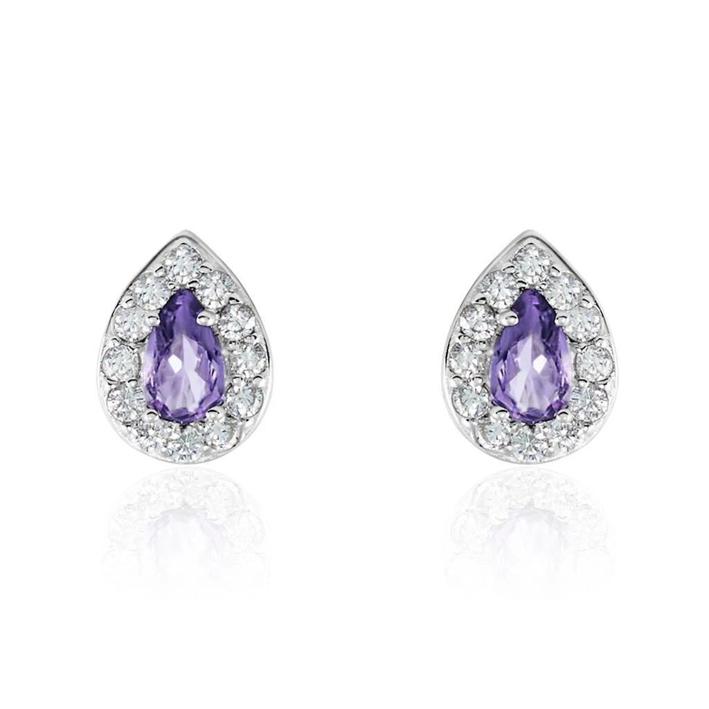 Boucles D’oreilles Puces Argent Blanc 925/1000 Gouttes Violettes Entourage Sertis Griffes Oxydes De Zirconium