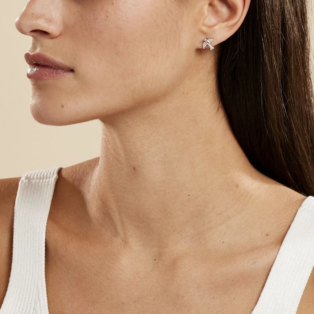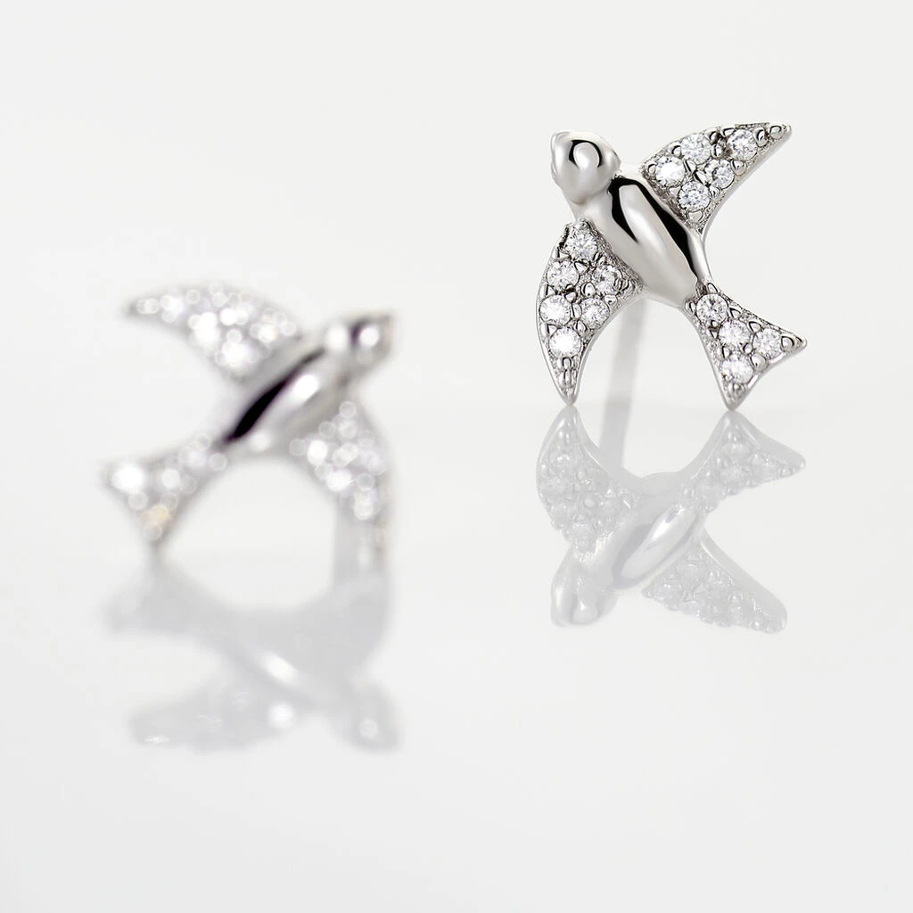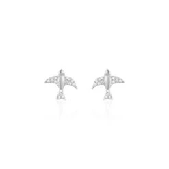 Boucles D’oreilles Puces Argent Blanc 925/1000 Motifs Hirondelles Avec Oxydes De Zirconium