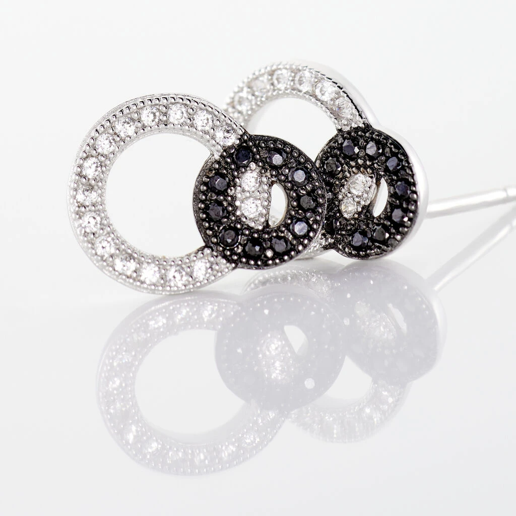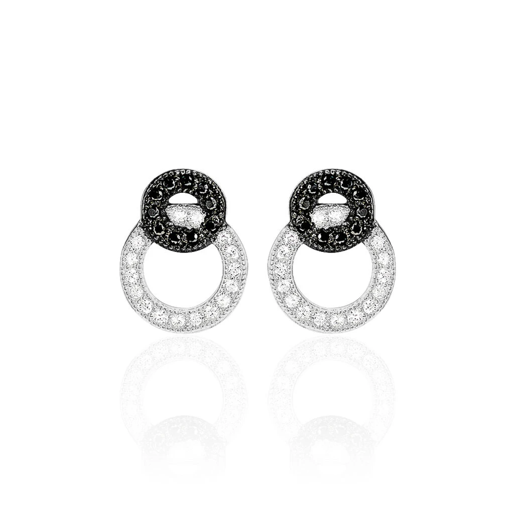 Boucles D’oreilles Puces Argent Blanc 925/1000 Double Cercles Oxydes De Zirconium Noirs Et Blancs