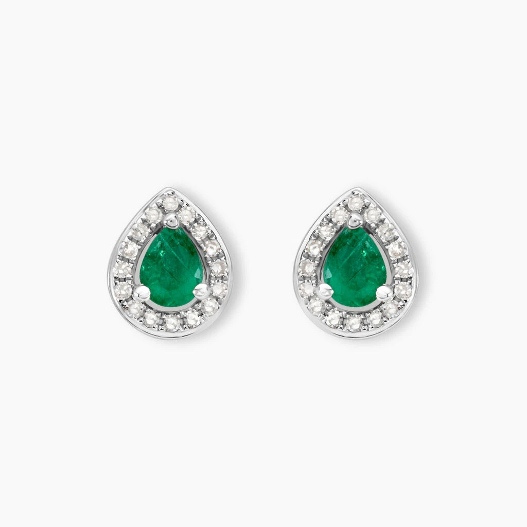 Boucles D’oreilles Or Blanc 375/1000 Goutte Emeraude Verte Central Entourage Pavage Diamants Blancs