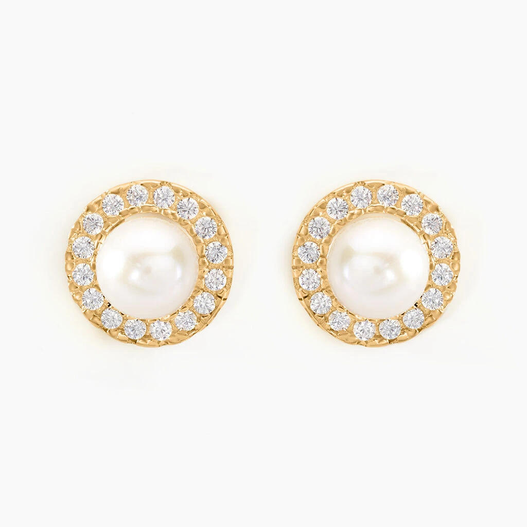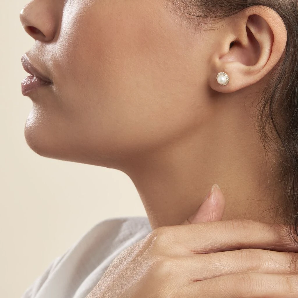 Boucles D’oreilles Or Jaune 375/1000 Perles De Culture 4mm Entourages Oxydes De Zirconium