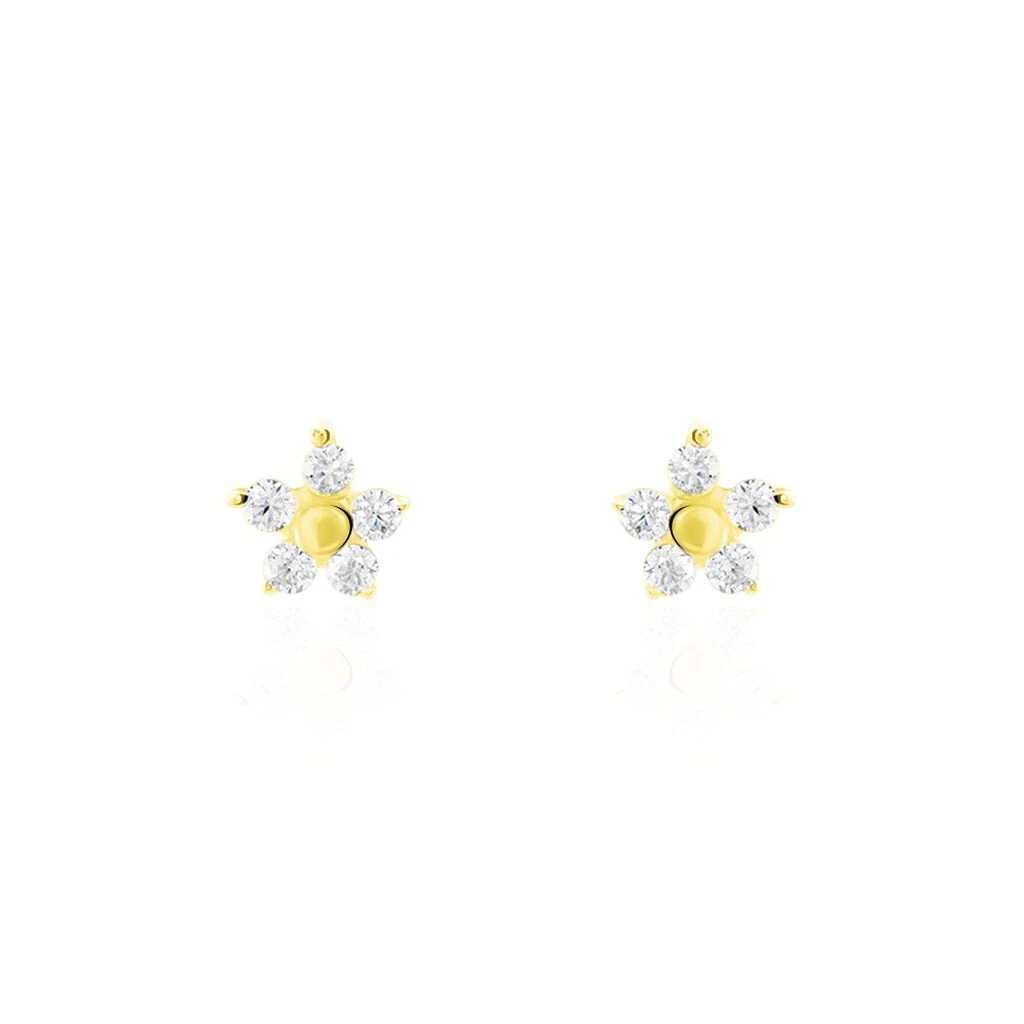 Boucles D’oreilles Puces Or Jaune 375/1000 Motif Fleur Oxydes De Zirconium