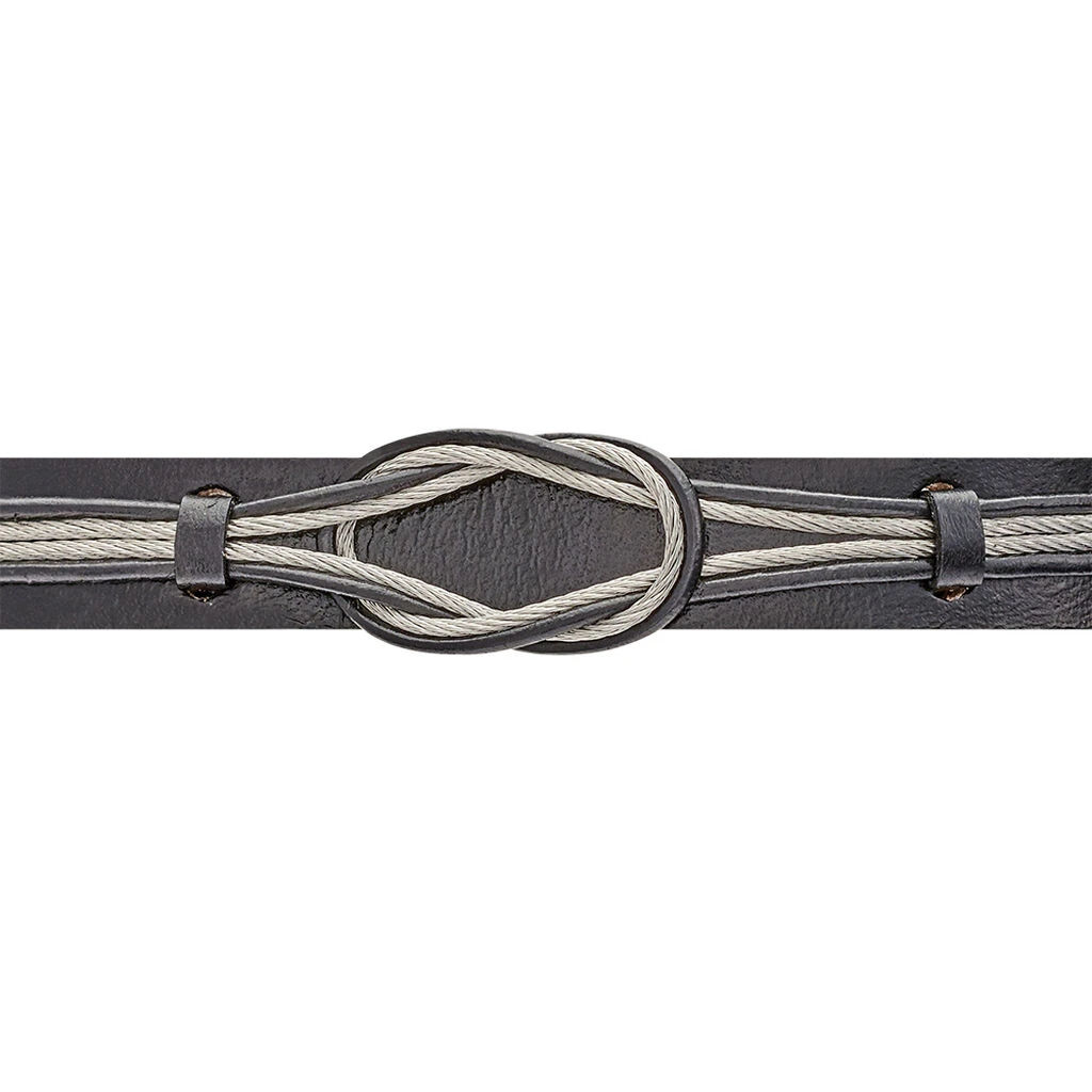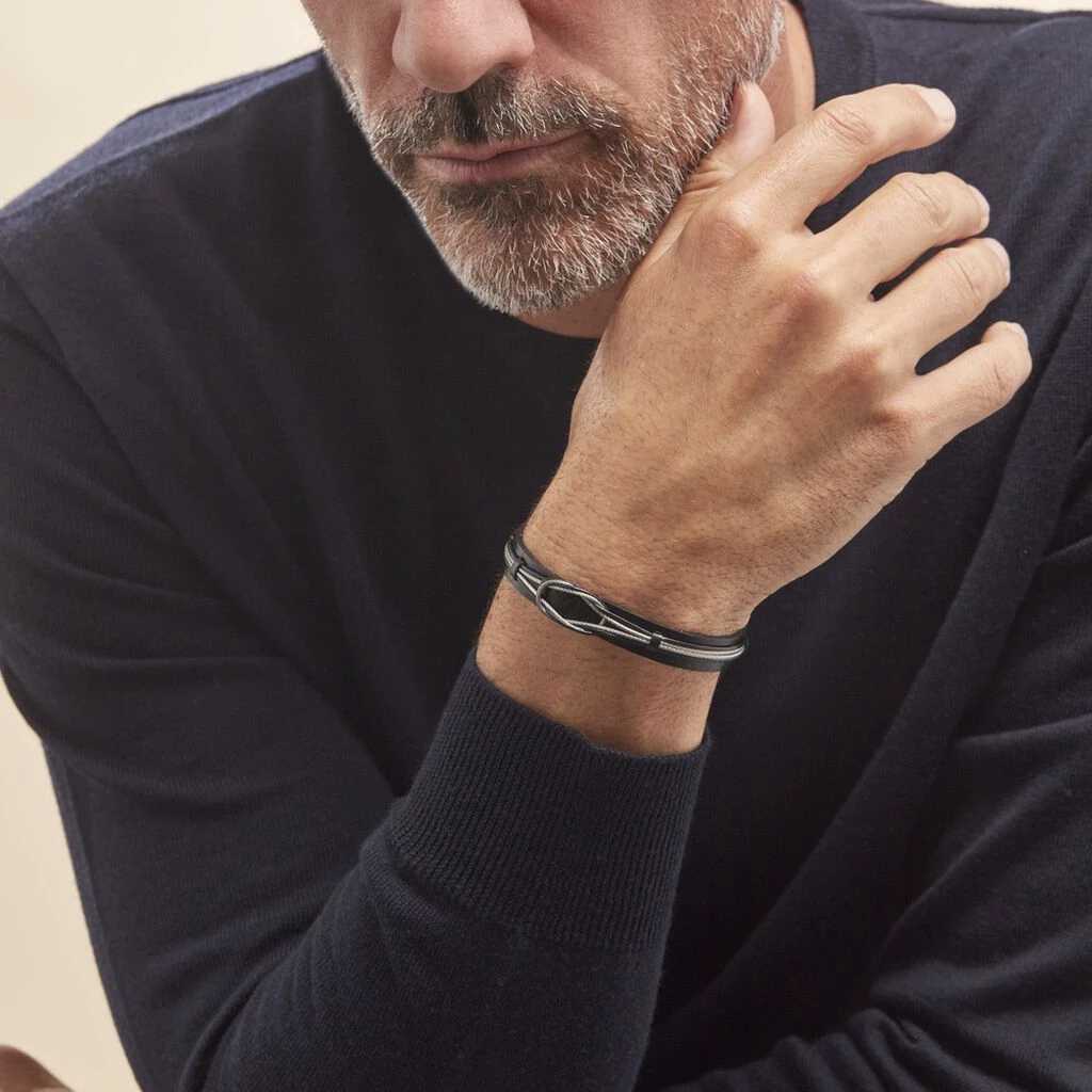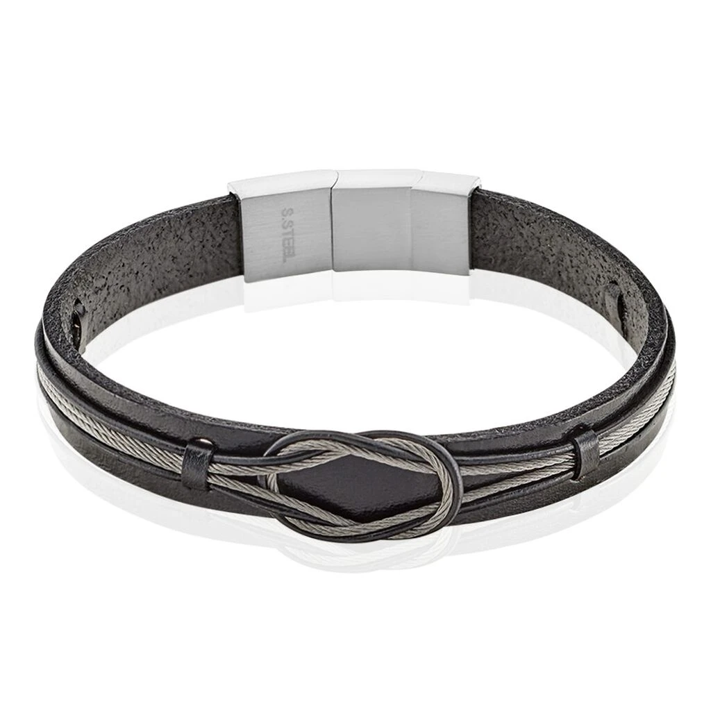 Bracelet Acier Blanc Cuir De Vache Noir Cable Avec Noeud Marin 21cm