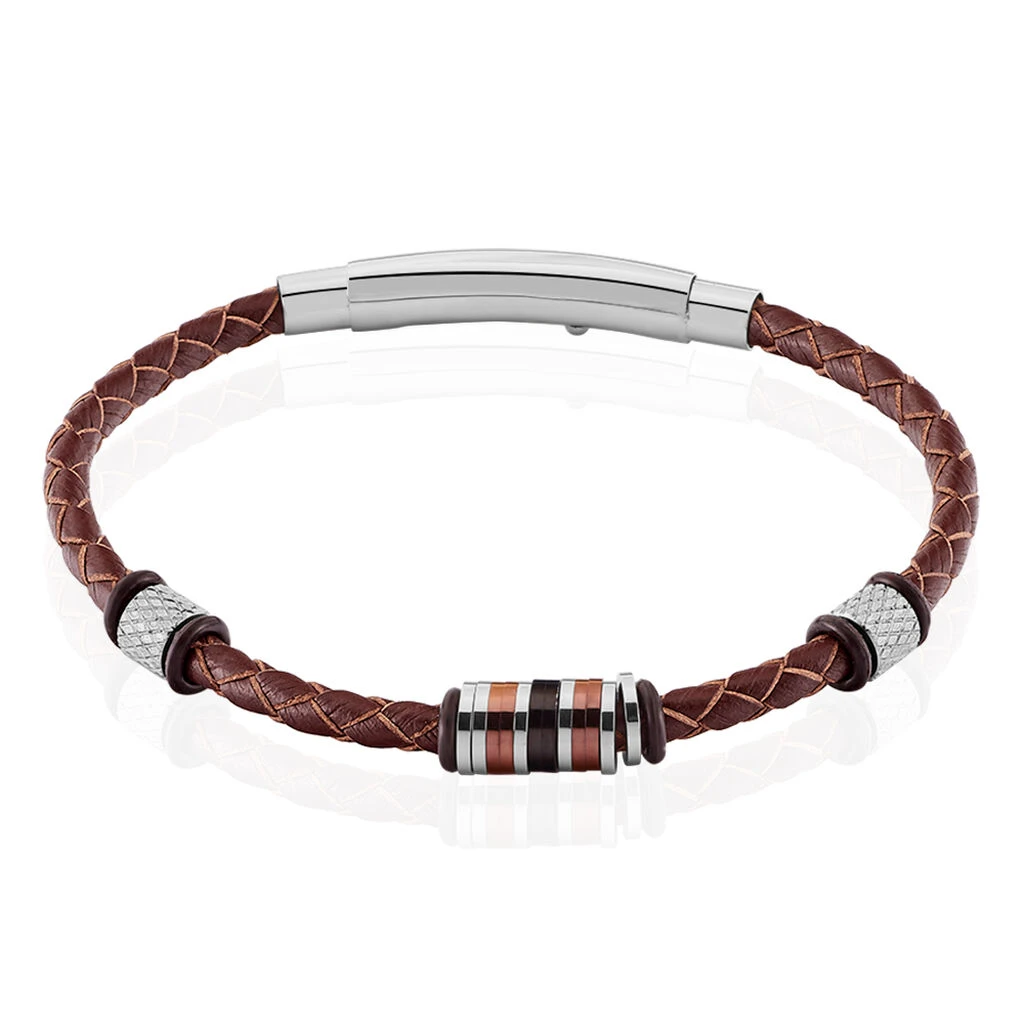 Bracelet Acier Cuir Marron Tresse Plaques Ip Brun Et Noir 21cm