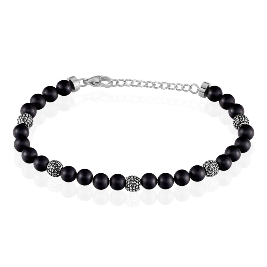 Bracelet Boules Acier Gris Pierres Agates Noires 22cm