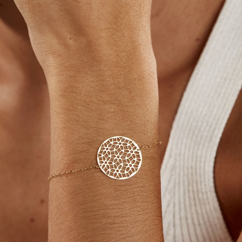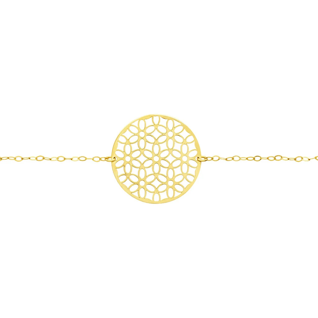 Bracelet Or Jaune 375/1000 Rond Ajoure Et Motifs Fleurs 19cm