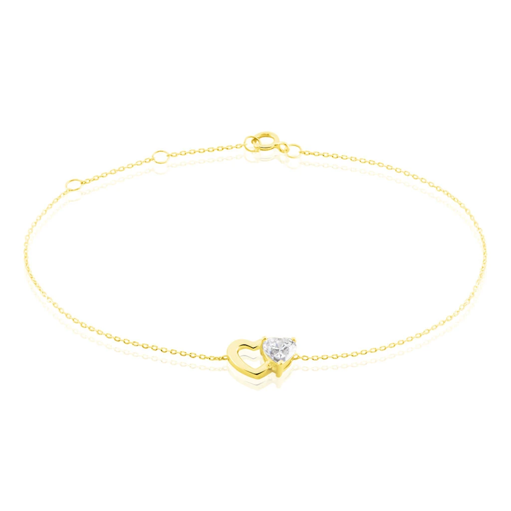 Bracelet Or Jaune 375/1000 Double Cœur Maille Forçat Oxyde De Zirconium 15.5+1.5+1.5cm