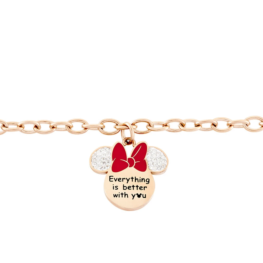 Bracelet Disney Acier Doré Rose Pampille Tête De Minnie Noeud Rouge Cristaux Blancs Maille Forçat 18.5cm 72-dst.70008l/02rg