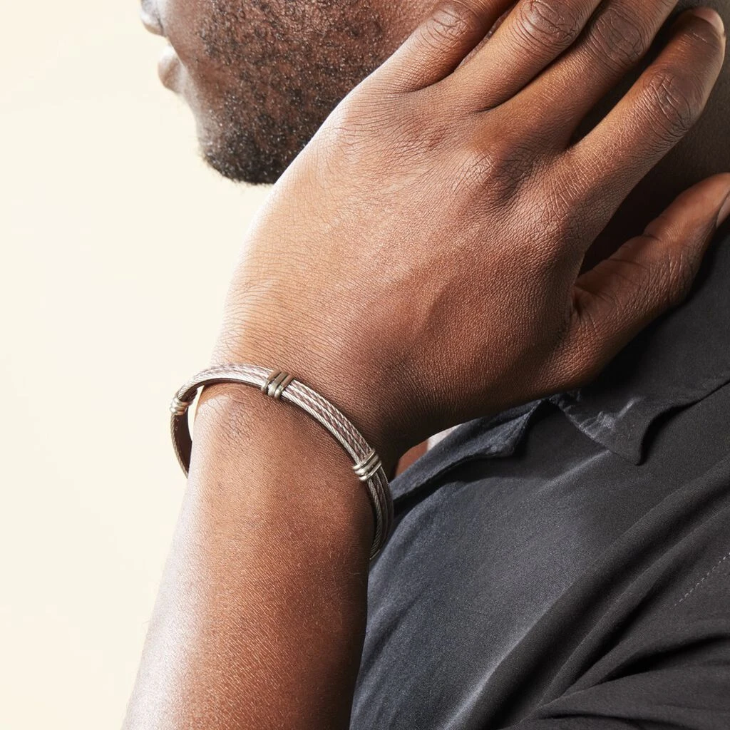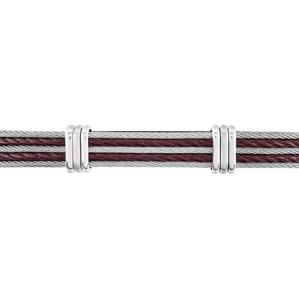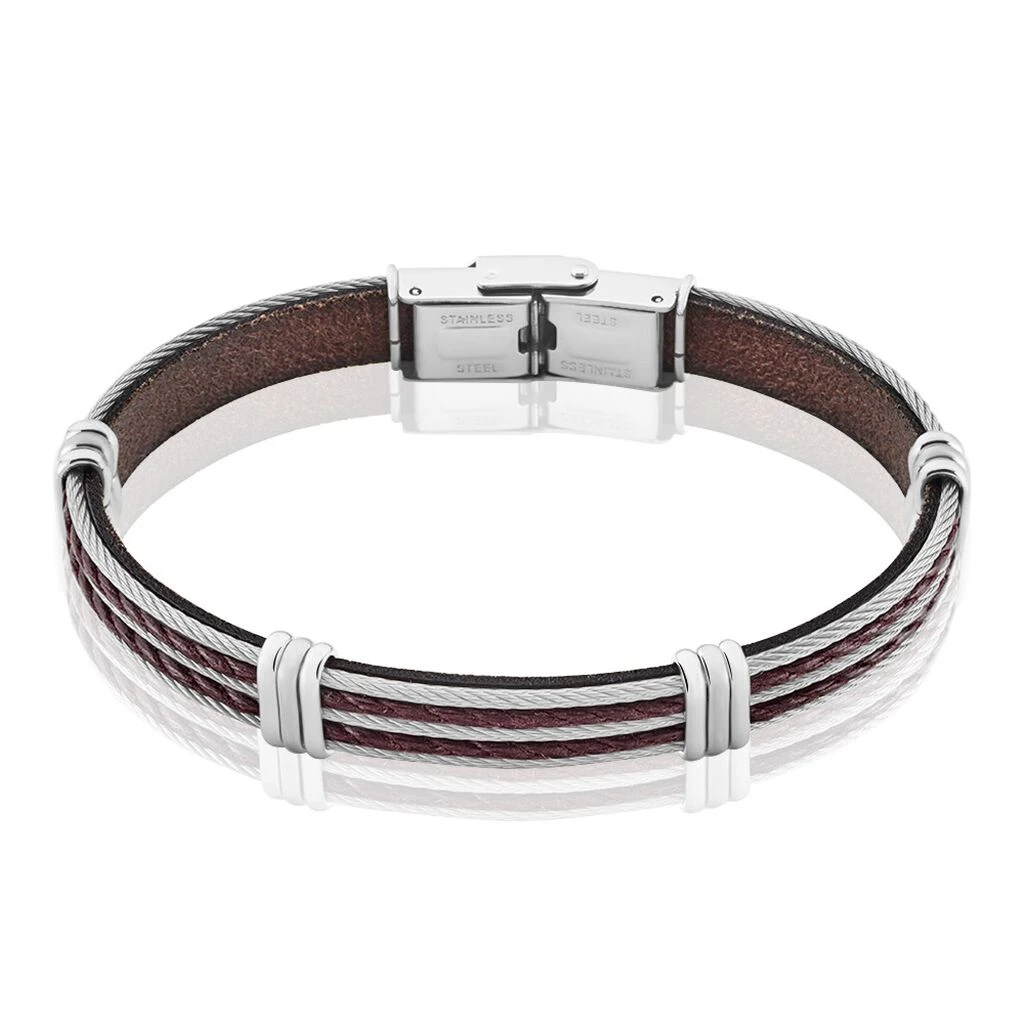 Bracelet Acier Blanc Triple Cable Acier Blanc Et 2 Fils Cotons Marrons Centraux 21cm