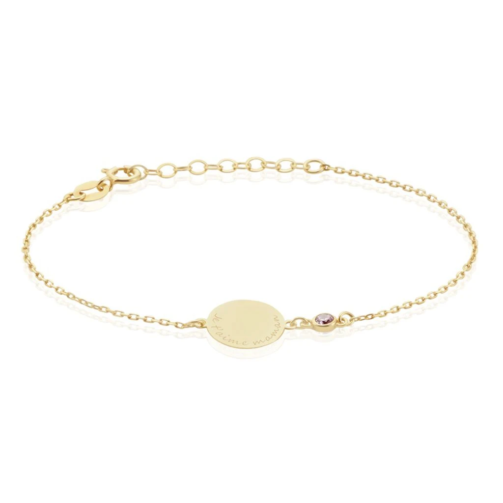 Bracelet Plaque Or Pastille Gravee Je T’aime Maman Pampille Sertie Clos Oxyde De Zirconium Rose Maille Forcat 16+3cm