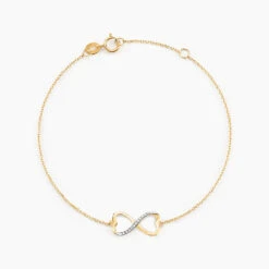 Bracelet Or Jaune 375/1000 Forme Infini Cœur Pavage Diamants Maille Forçat 18cm