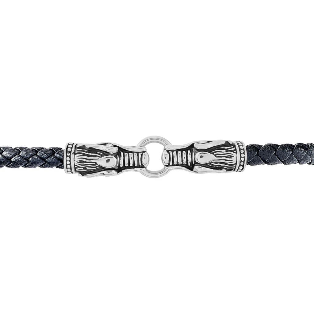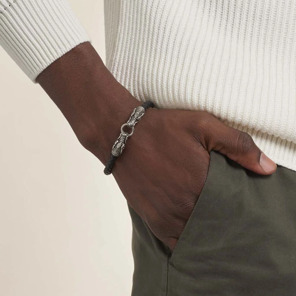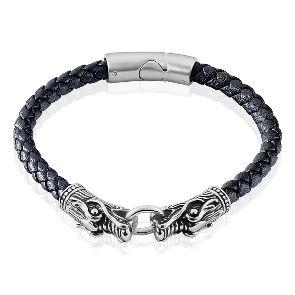 Bracelet Cuir De Veau Noir Et Acier Gris Tetes De Dragon