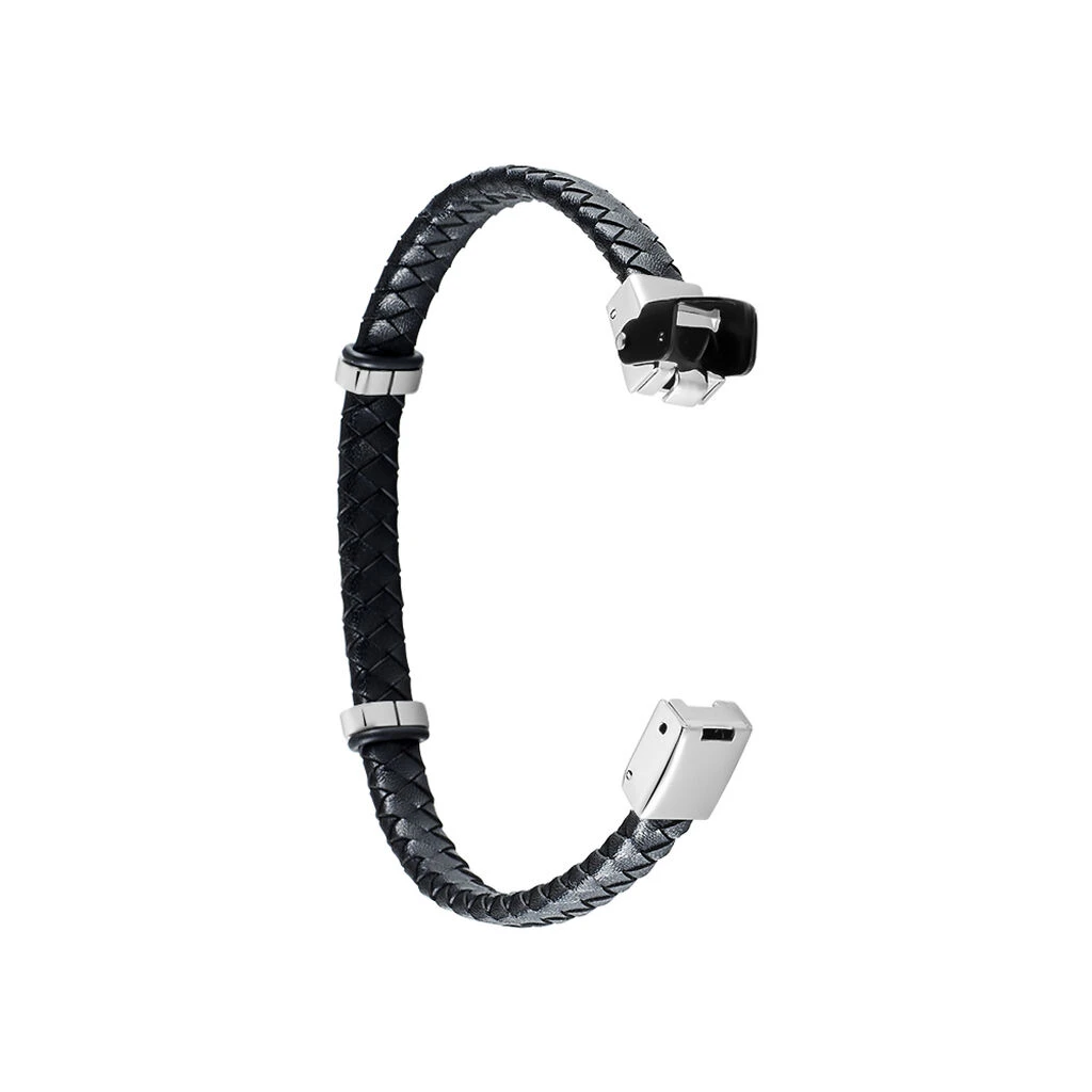 Bracelet Acier Blanc Cuir Tresse Noir Et Pierres Noires 21cm