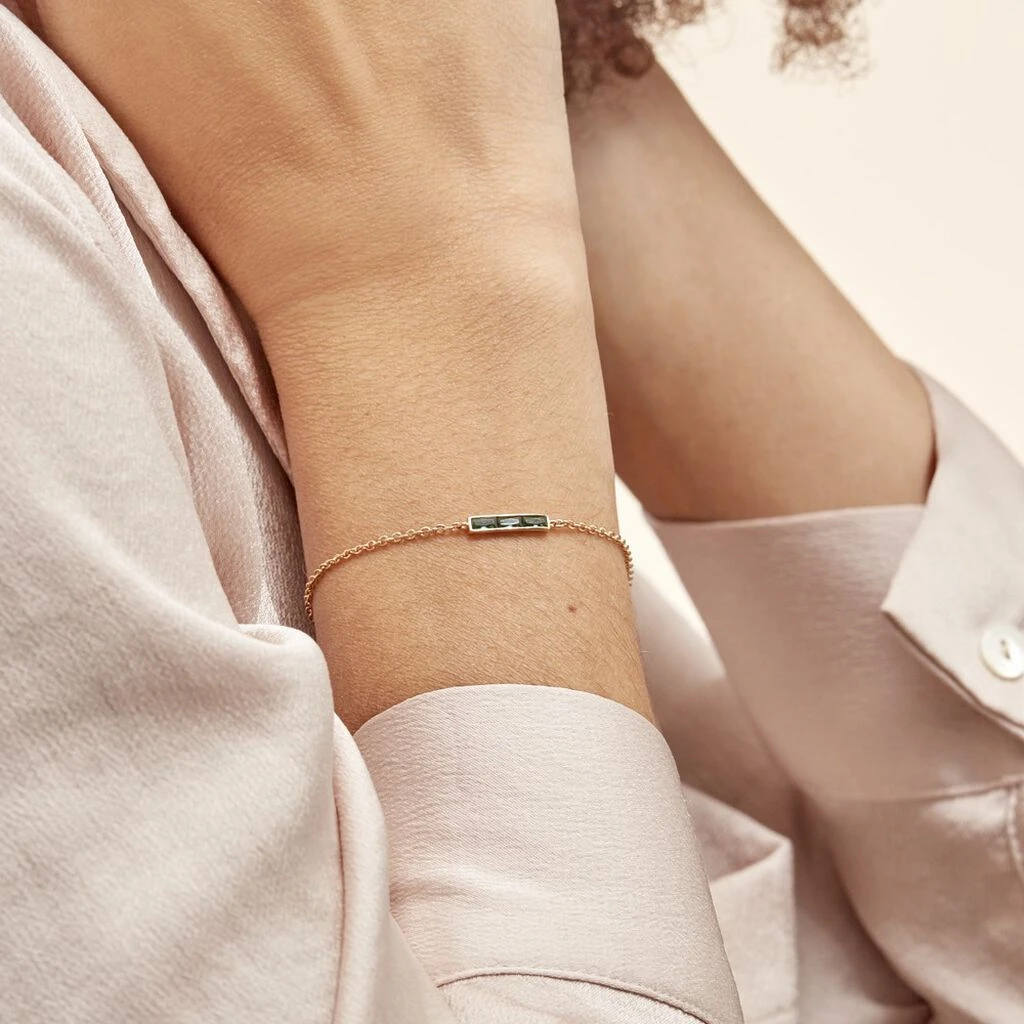 Bracelet Plaque Or Jaune Barrettestertie Rail Oxydes De Zirconium Verts Maille Forcat 16+2cm
