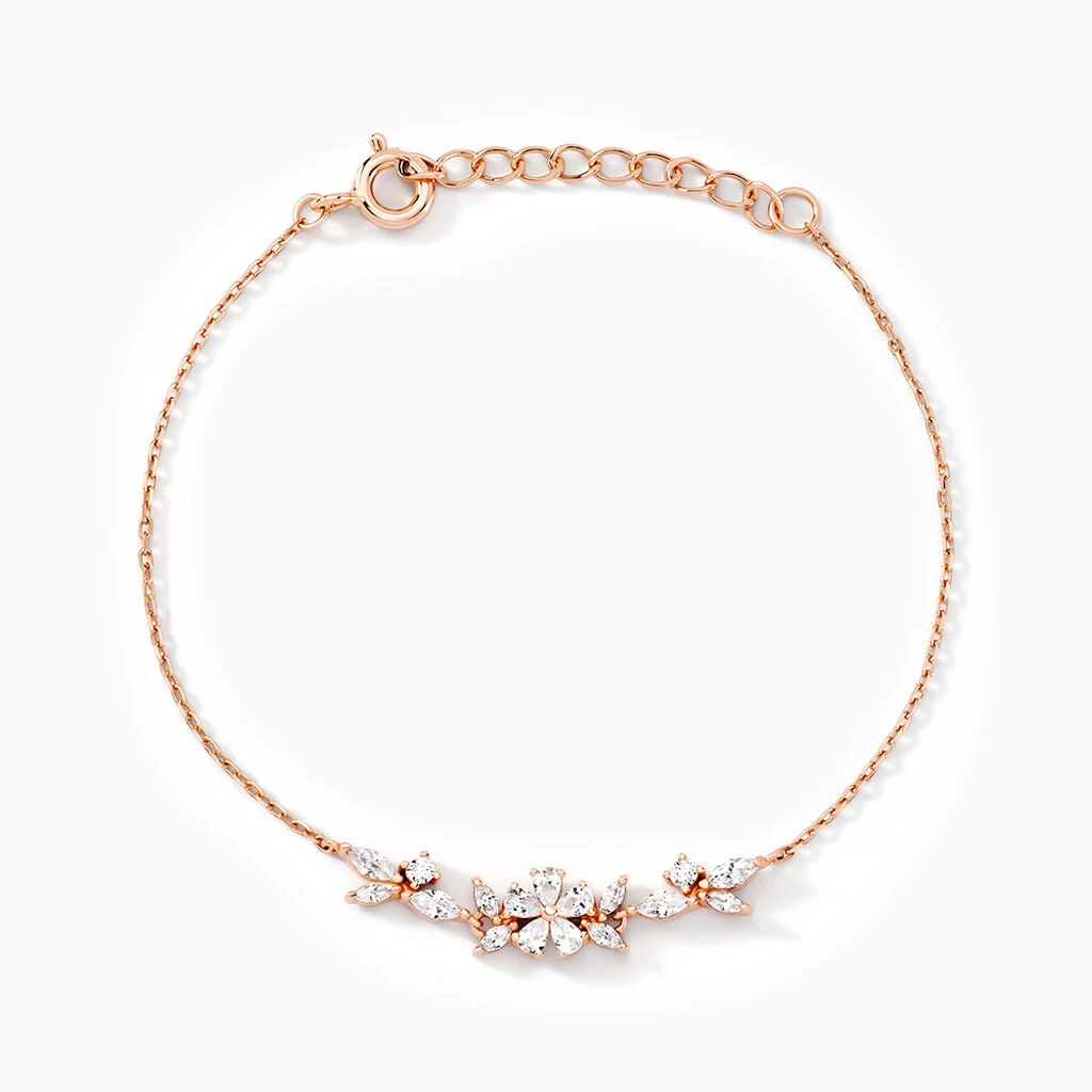 Simple, mais tout aussi chic, ce bracelet en argent rose 925/1000ème vous séduira. Il est sublimé par des oxydes de zirconium blancs dessinant des fleurs. La chaîne à maille forçat s’achève par des anneaux d’ajustement. Ce modèle s’adapte à tous les looks et saura valoriser votre tenue, quelles que soient les occasions.