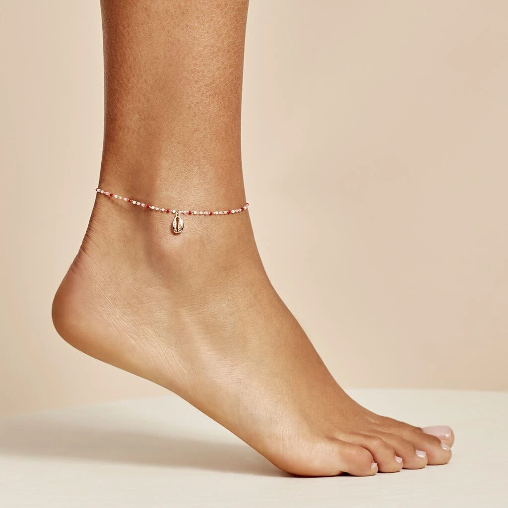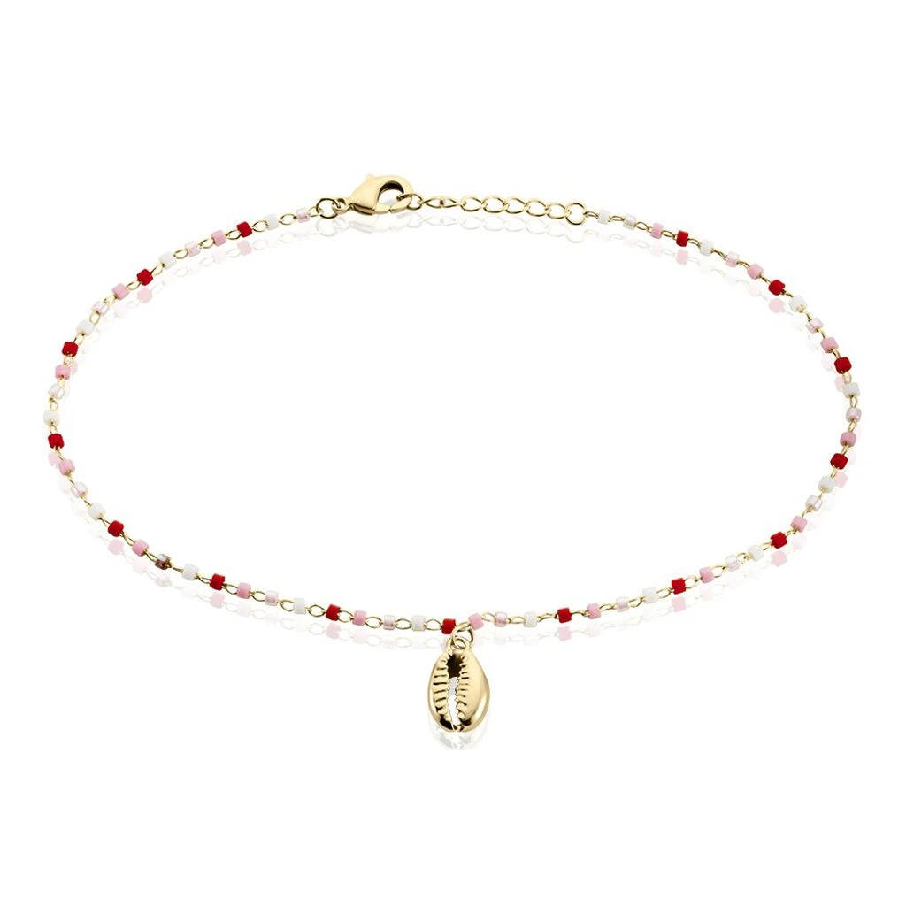 Chaine De Cheville Plaqué Or Jaune Pampille Coquillage Perles De Miyuki Roses Et Blanches 25cm