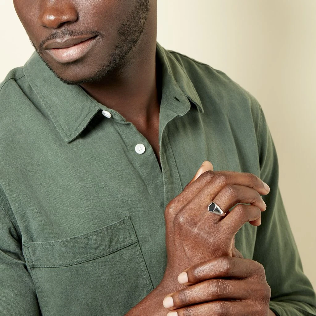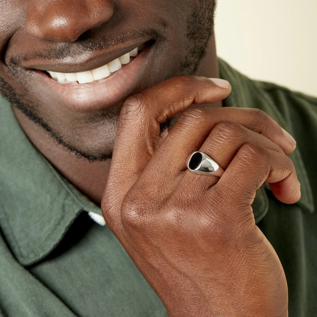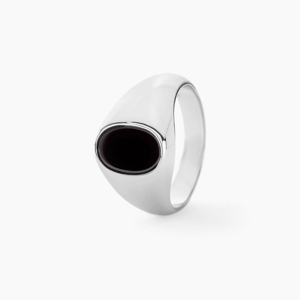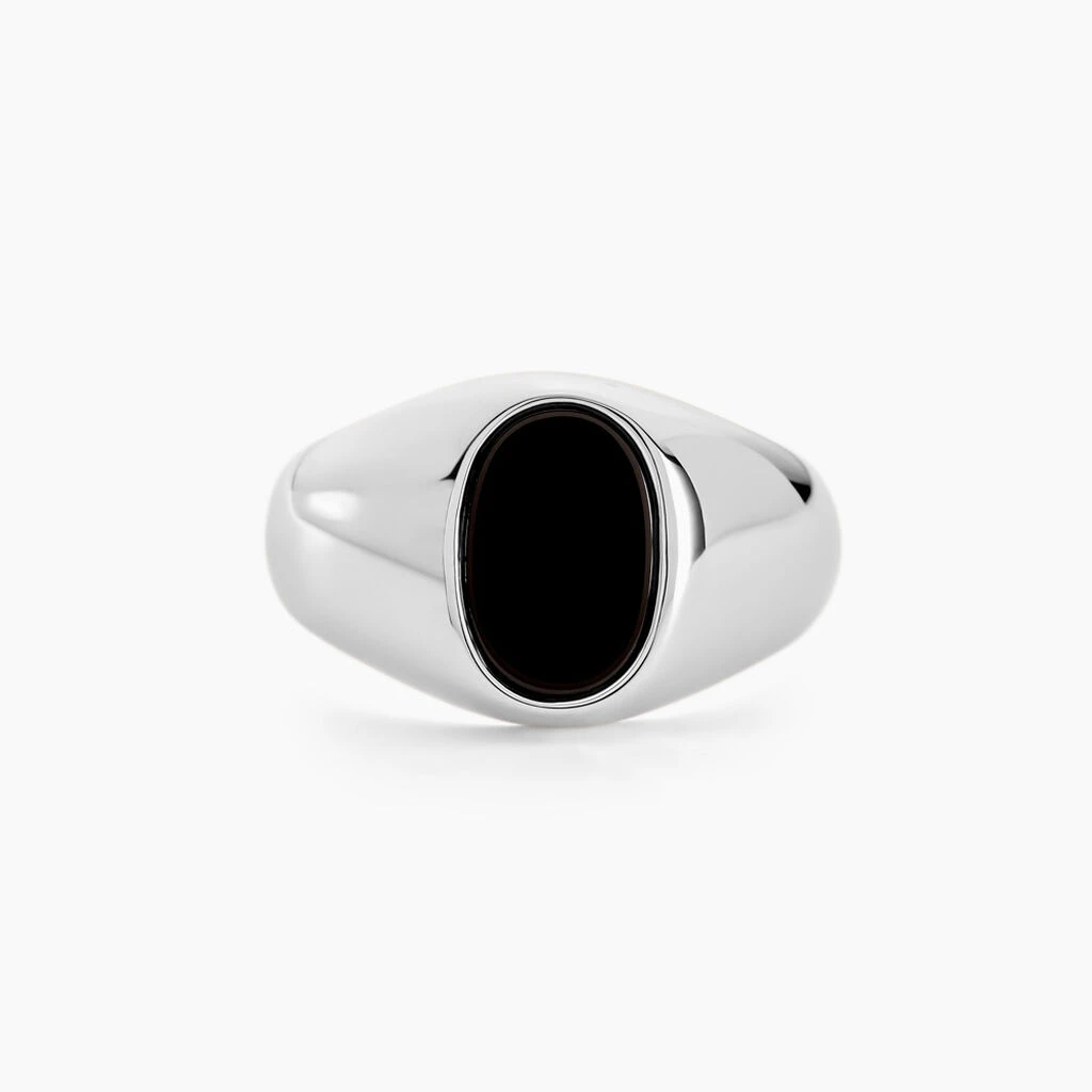 Chevaliere Argent Blanc 925/1000 Plateau Ovale Pierre Noire