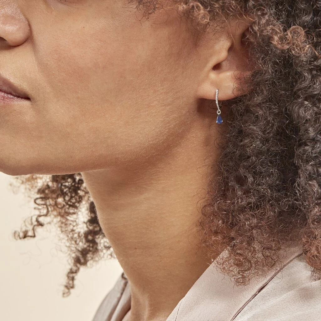Créoles Or Blanc 375/1000 Saphir Bleu Forme Poire Serti Griffes Pavage Diamants 10mm