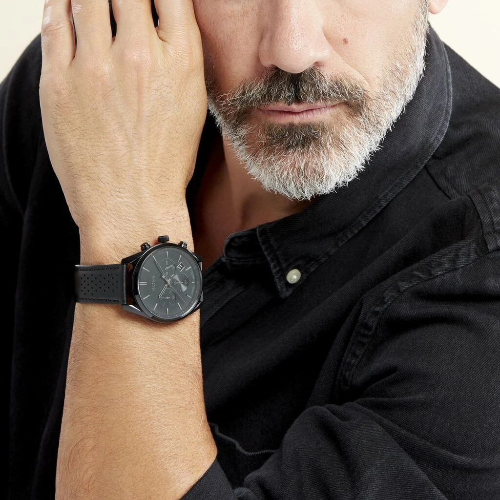 Montre Boss Champion Acier Noir Ronde Quartz Chronographe 44mm Fond Noir Bracelet Cuir De Veau Noir 1513880