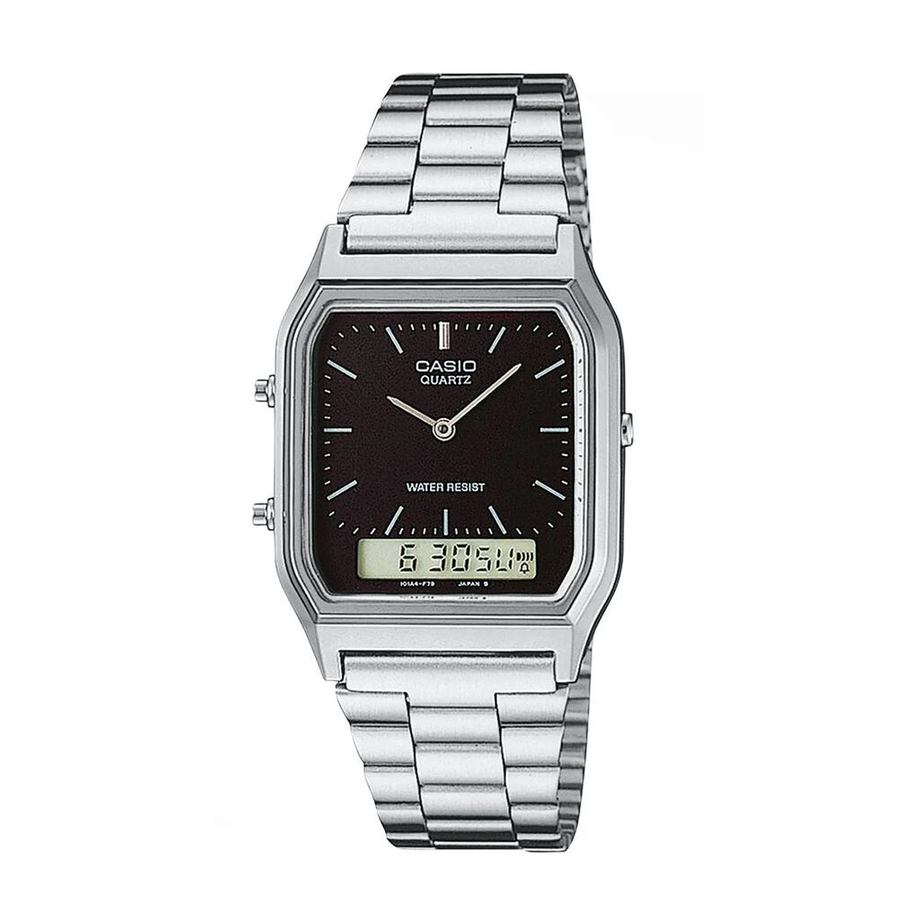 Montre Casio Collection Vintage Edgy Resine Argente Rectangulaire Quartz Anadigitale 28mm Fond Noir Bracelet Acier Argente Aq-230a-1dmqyes