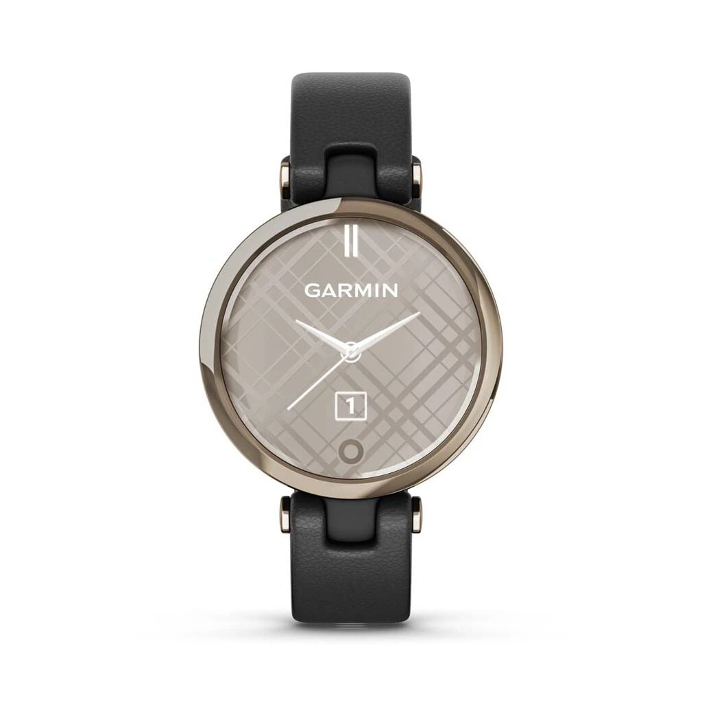 Montre Garmin Lily Polymère Renforce Noir Ronde Connectée 34.5mm Lunette Dore Crème Bracelet Cuir Noir 5atm 010-02384-b1
