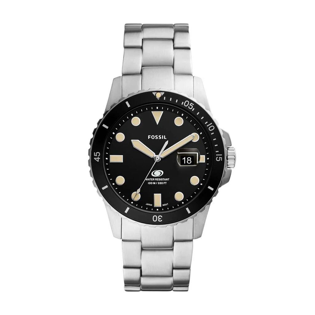 Montre Fossil Blue Acier Argenté Ronde Quartz 42mm Fond Noir Bracelet Acier Argenté Fs5952