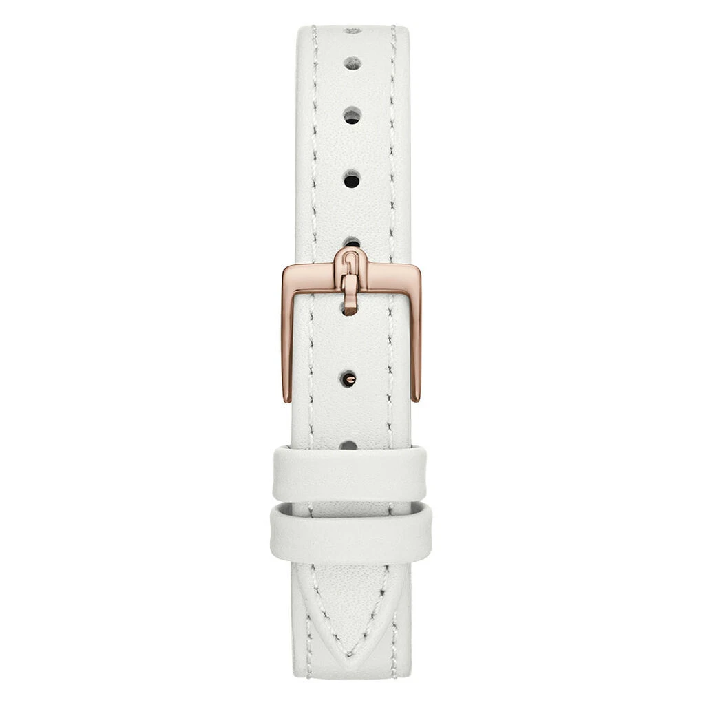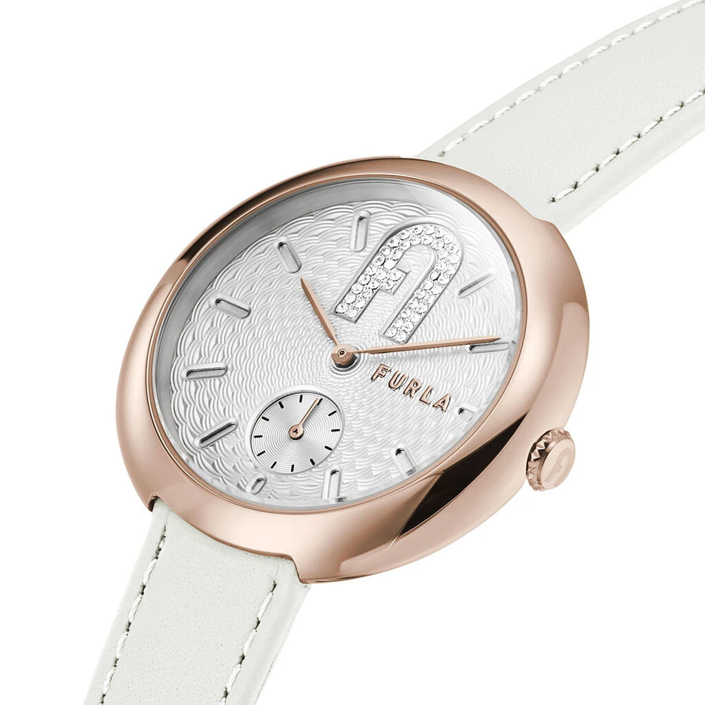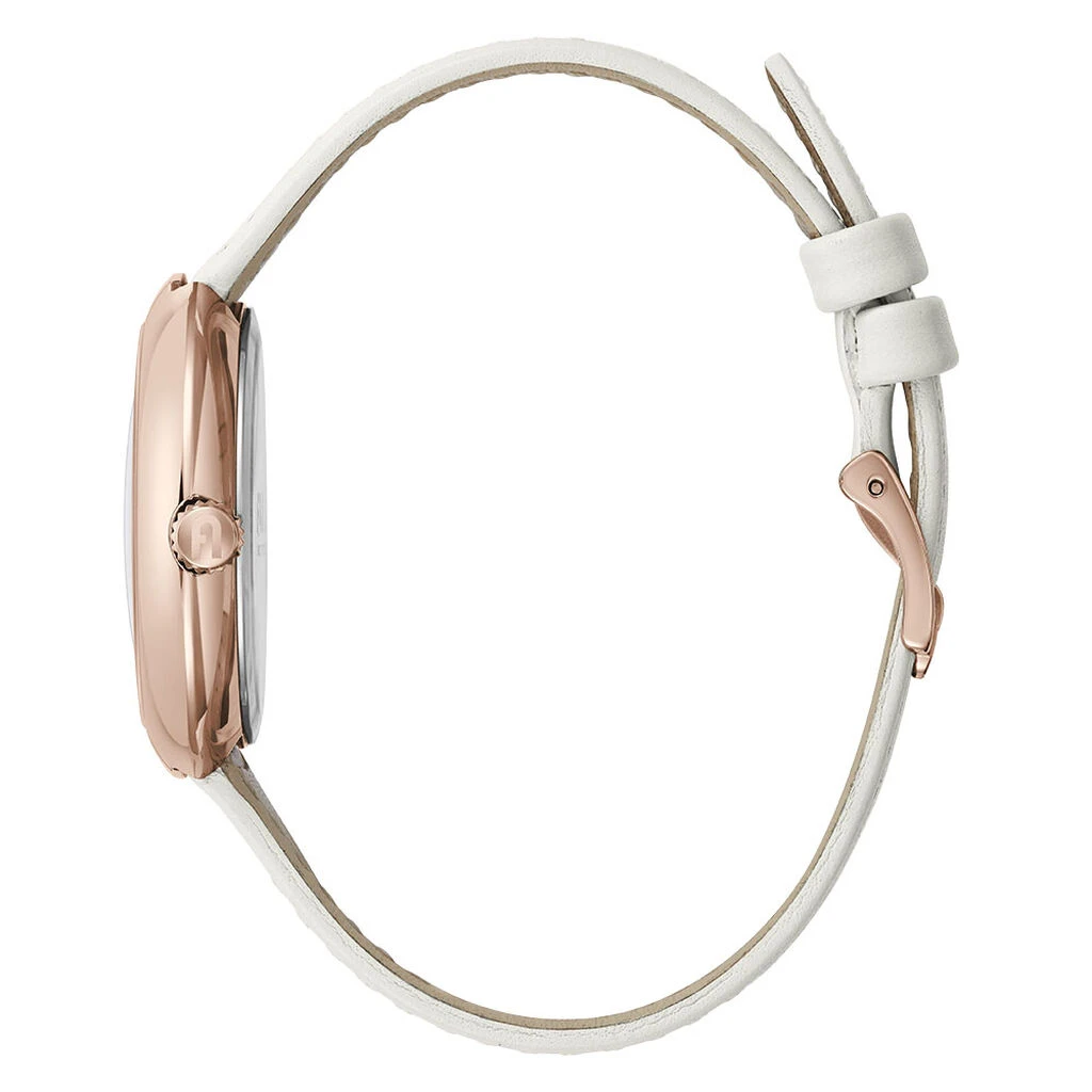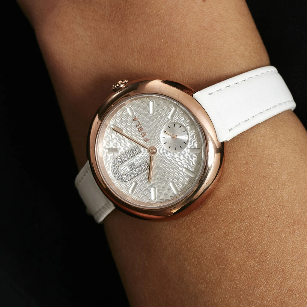 Montre Furla Cosy Seconds Acier Doré Rose Ronde Quartz 36 Fond Argenté Bracelet Cuir Blanc Ww00013004l3