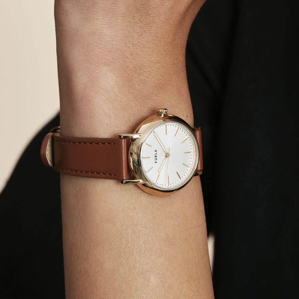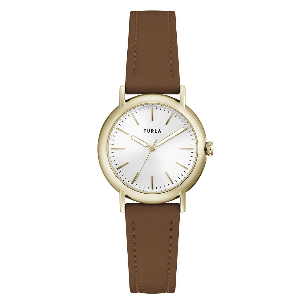 Montre Furla Easy Shape Acier Doré Ronde Quartz 32mm Fond Argenté Bracelet Cuir Marron Ww00024003l2